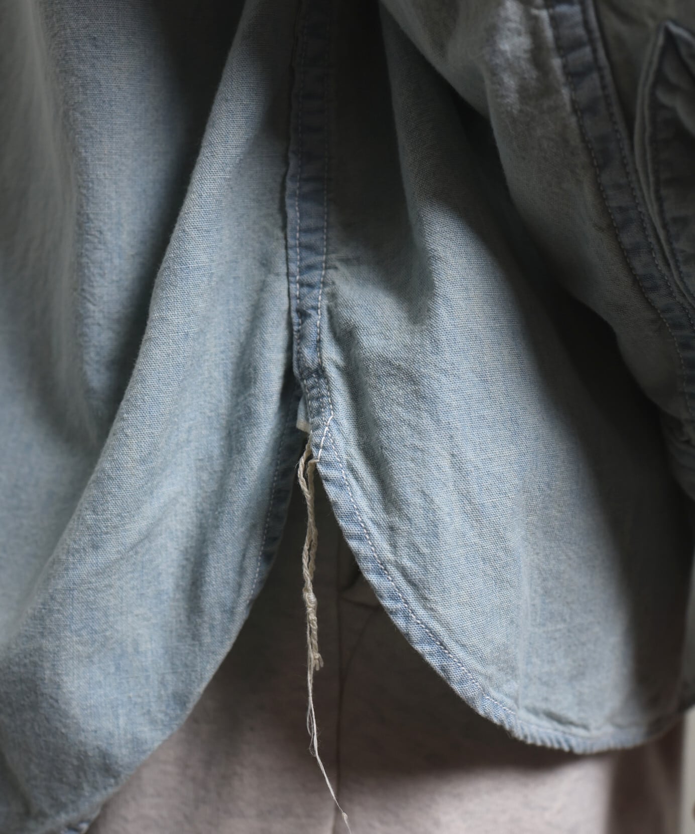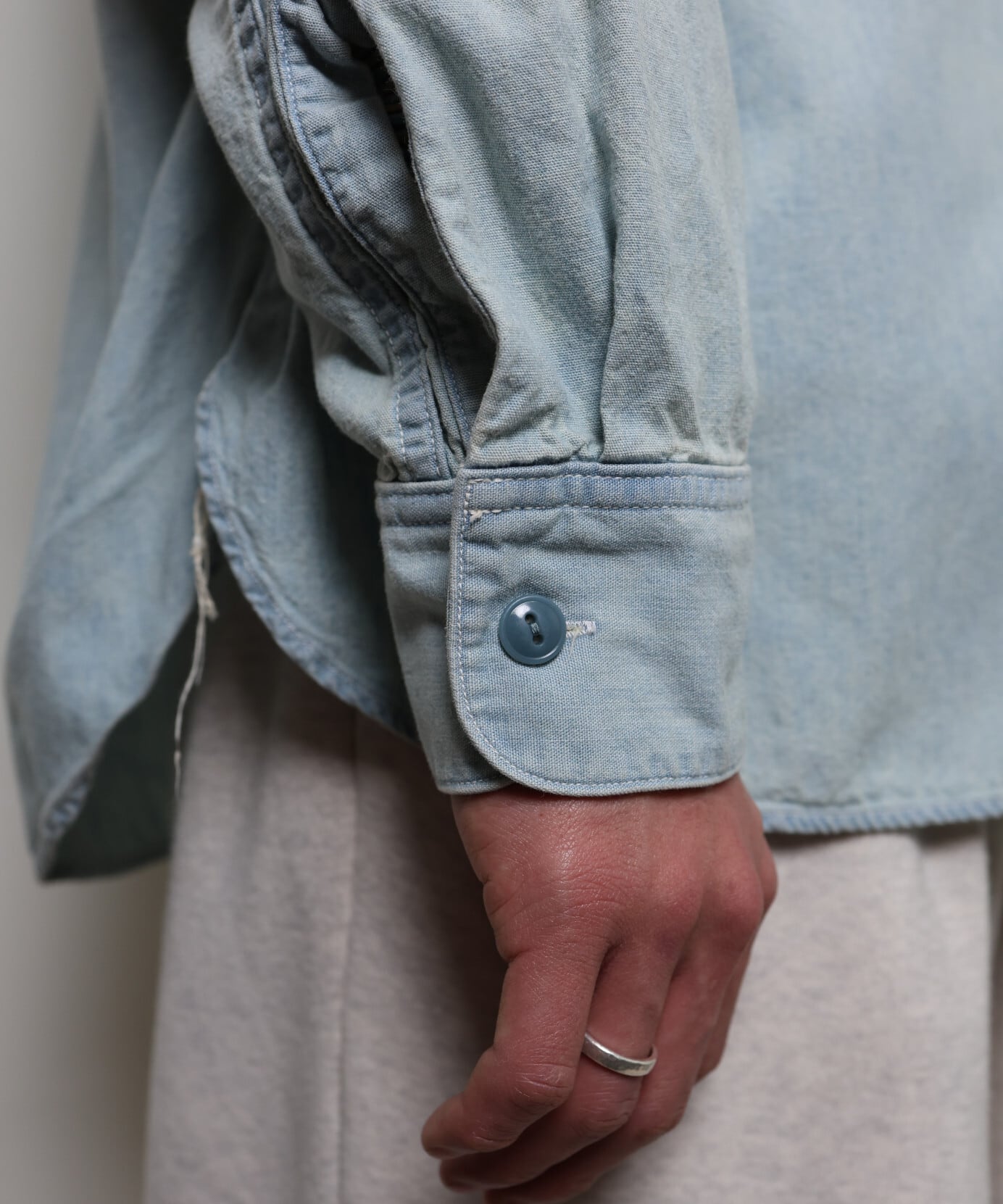 シャンブレーといえば古着やアメカジを連想しますが、身幅が狭く着丈が長いものも多い印象。その点こちらはバランスが良く、色落ちの表情やボタン、裾のディテールまで丁寧に作り込まれた一着。個人的にもかなり好みです。