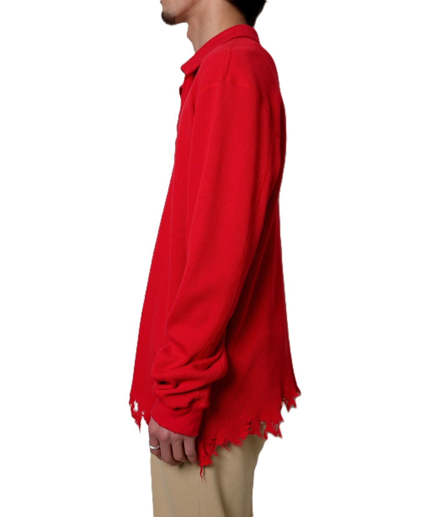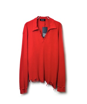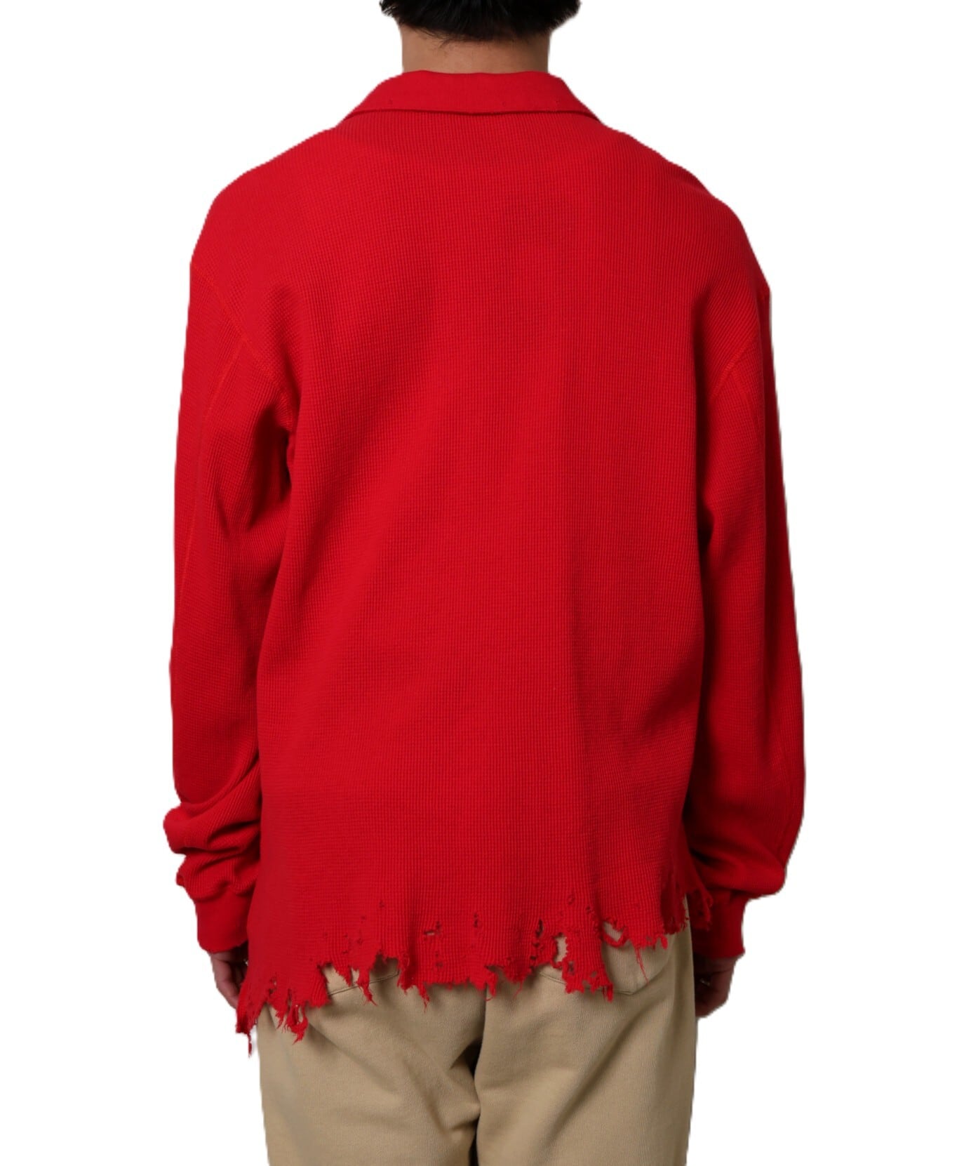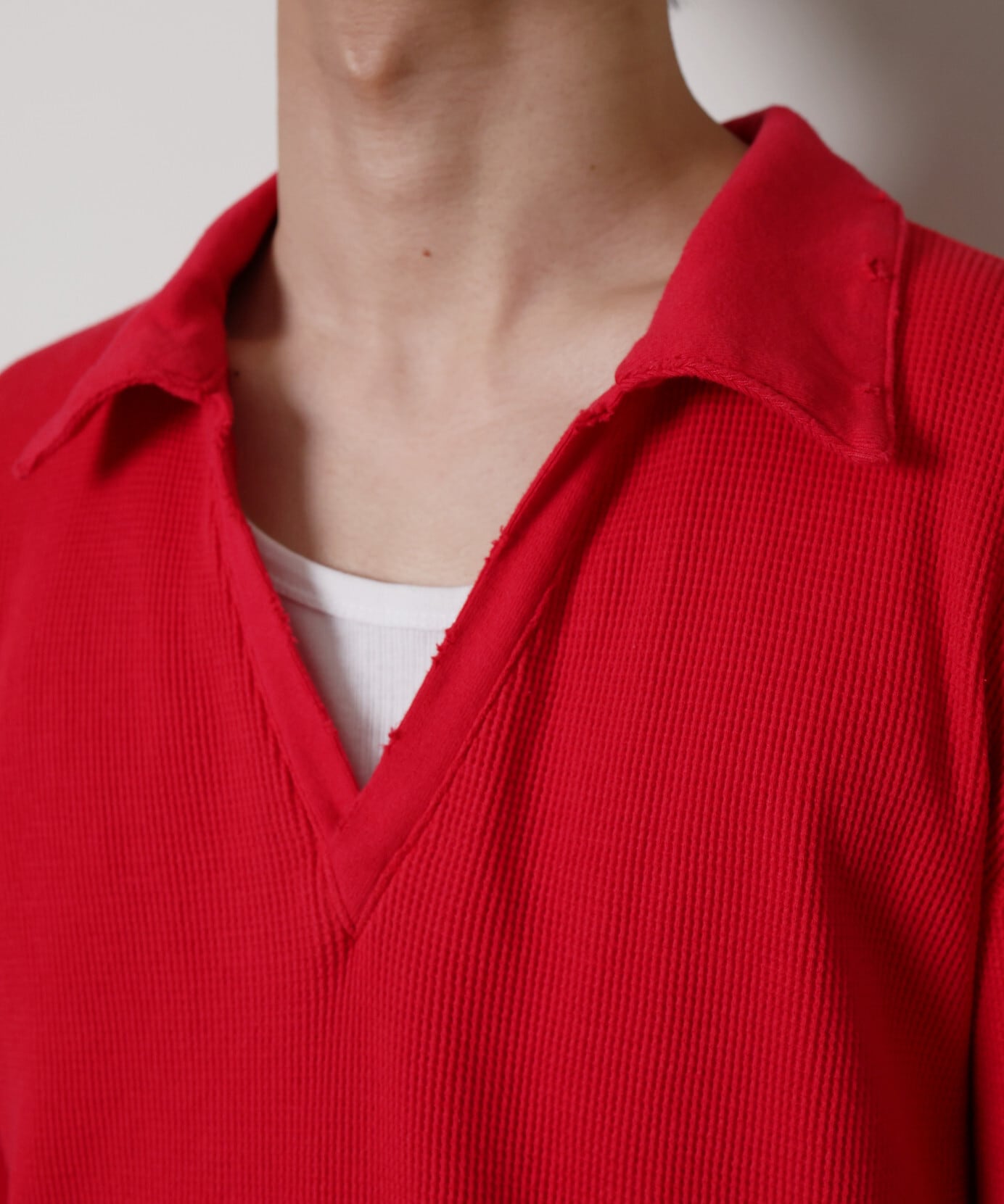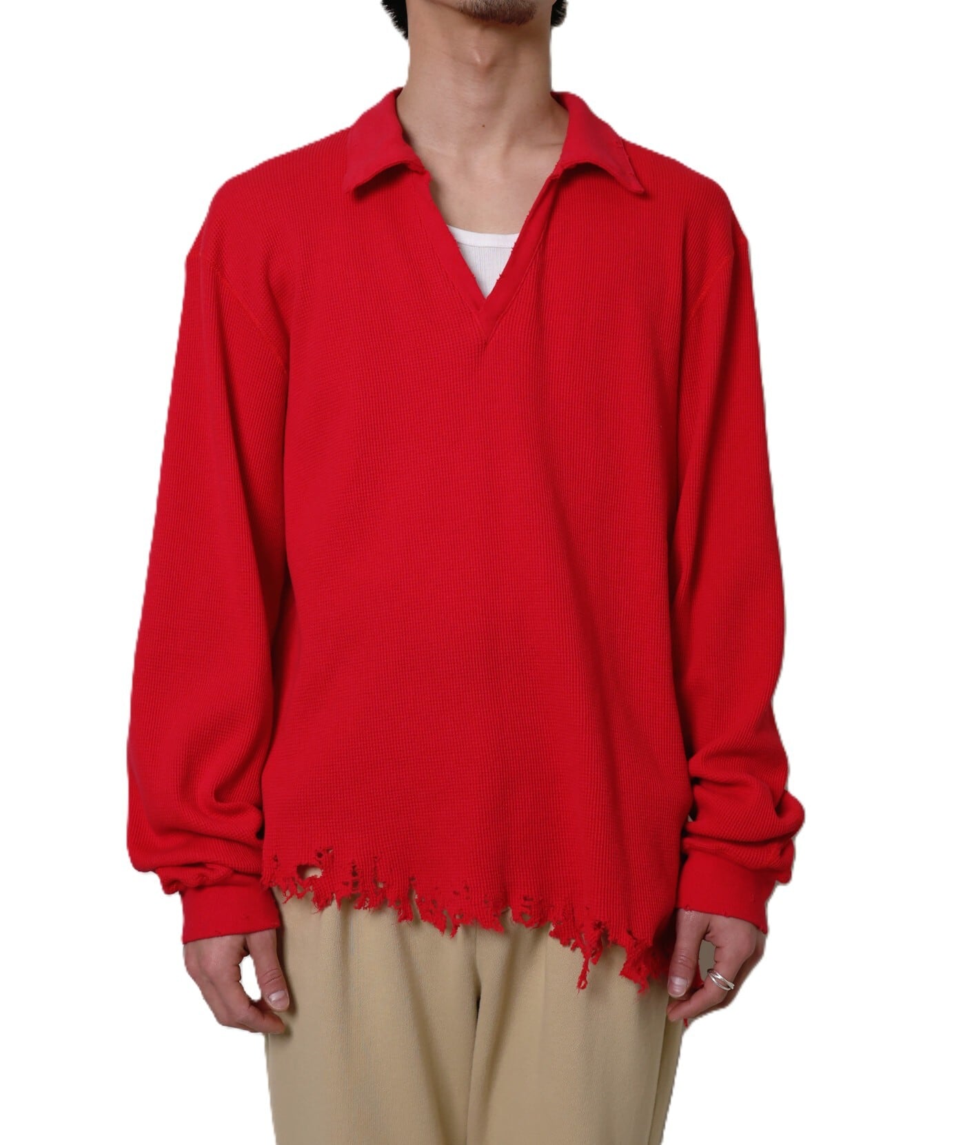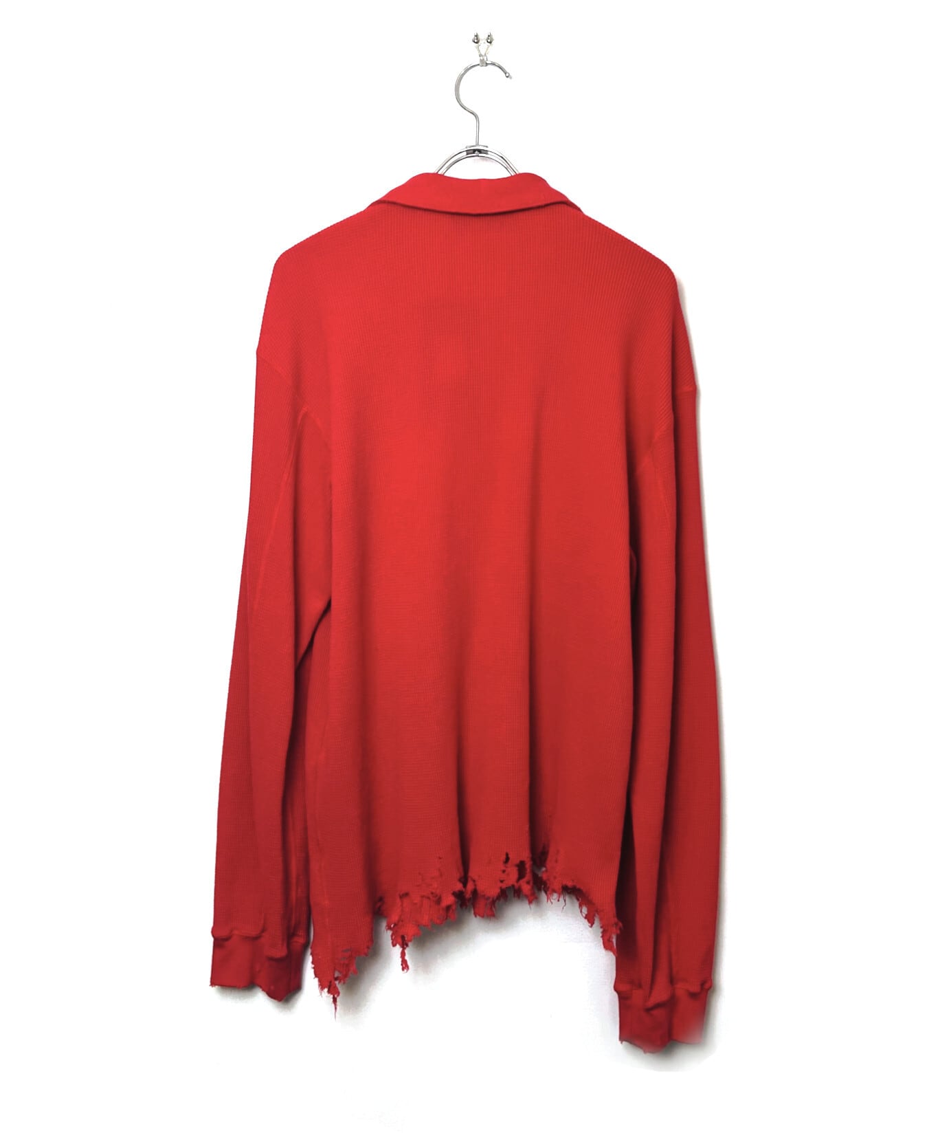 ブランドの定番でもあるサーマルシリーズをアップデートし製作された新型のスキッパーポロシャツです。シグネチャーディテールでもある裾のアシンメトリーカットやグラインダーを用いた手作業のダメージ加工はそのままに、前下がりの衿と立体的な2枚袖、袖リブ仕様など上品な佇まいにまとめたバランス。