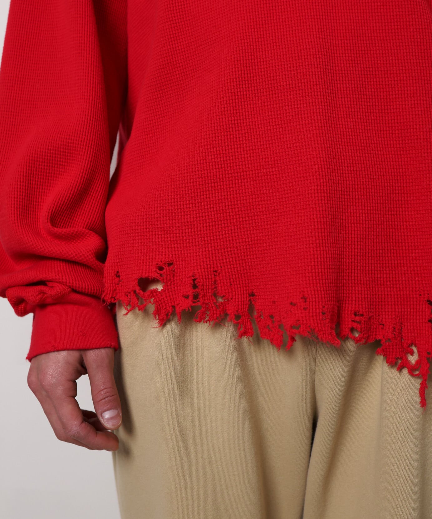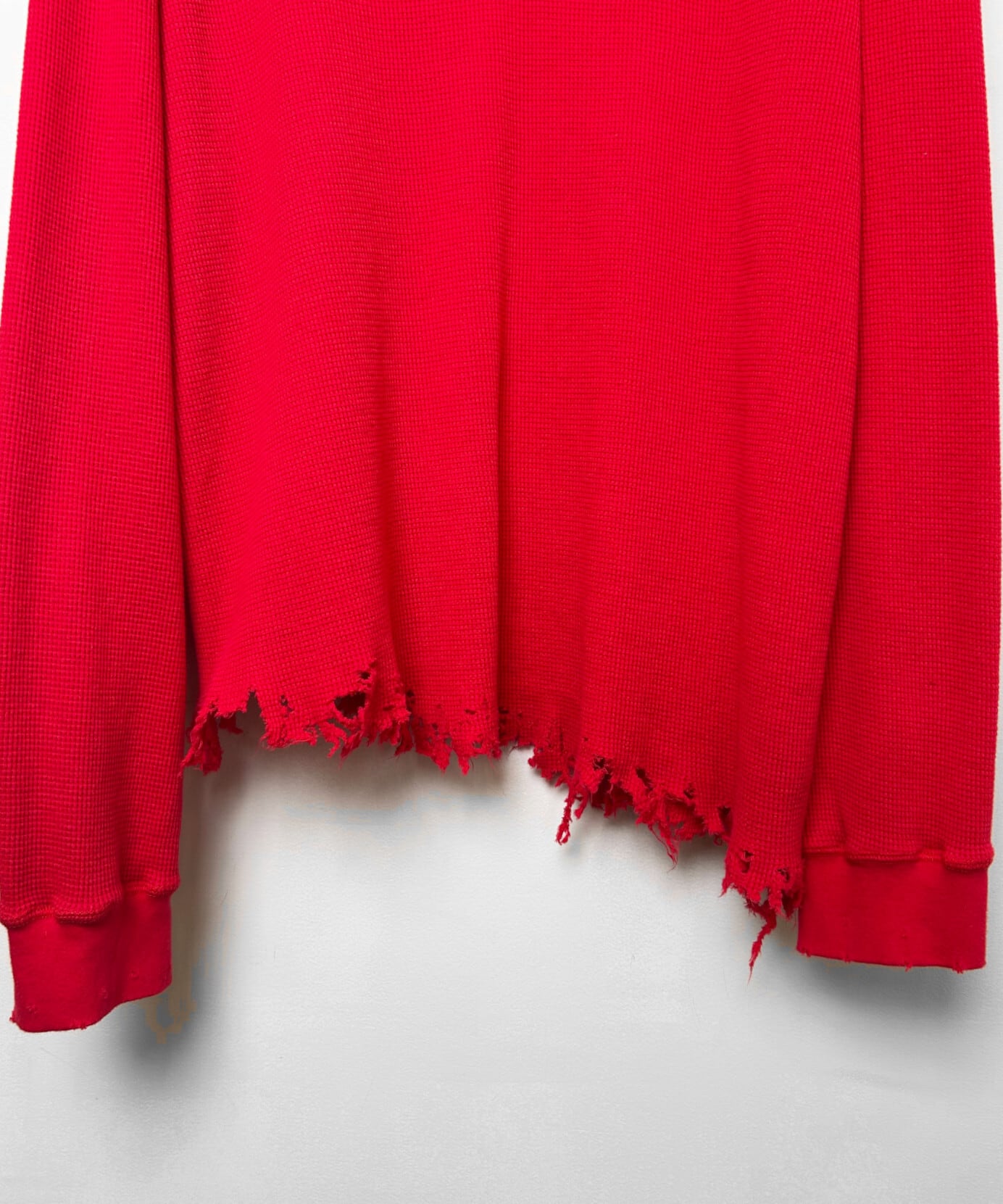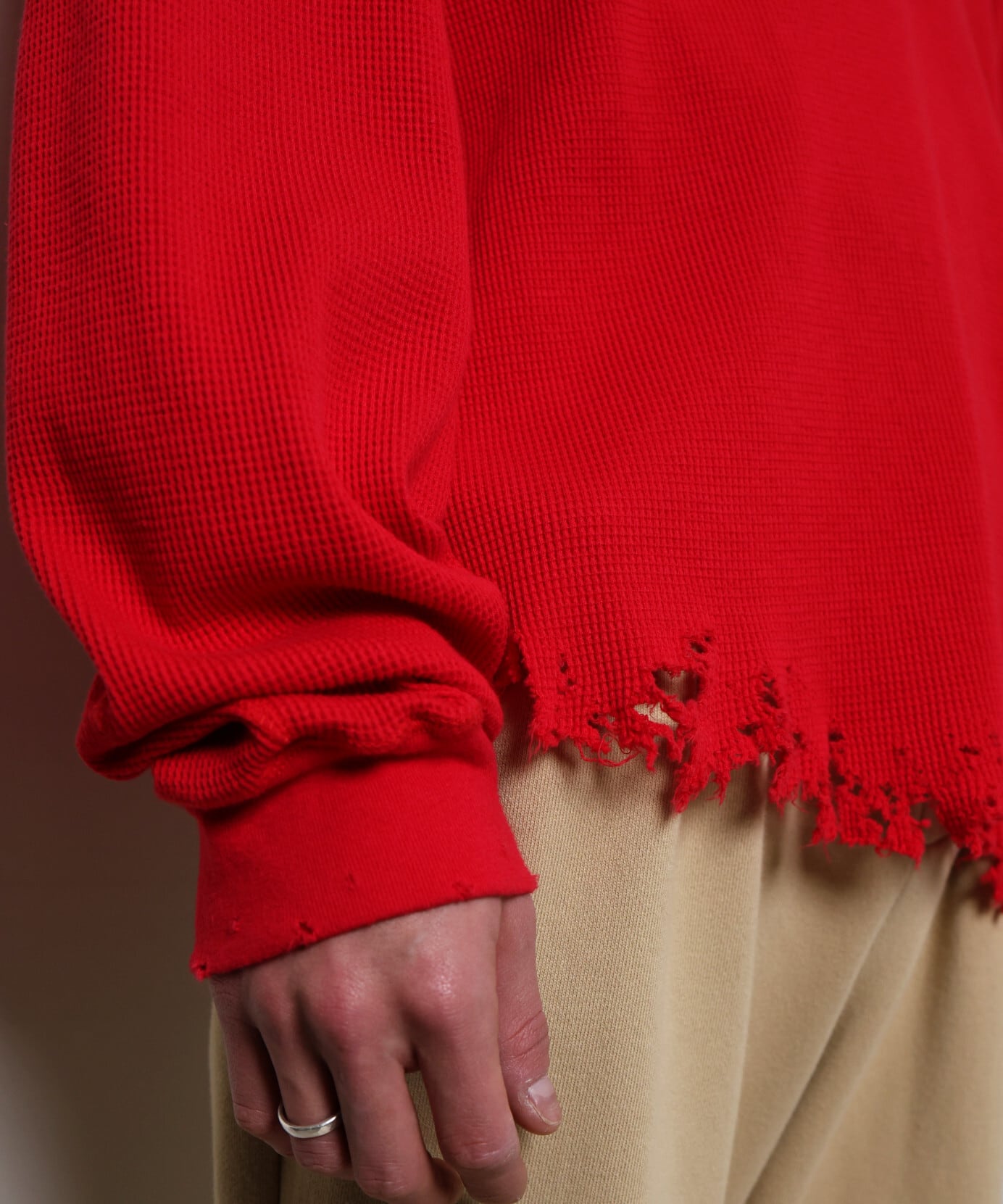 さらに、アシンメトリーな裾やボロ加工の襟・裾がさりげないアクセントに。インナー使いしたときも、レイヤードにしっかり表情を出してくれます。サーマルならではの保温性と肌離れの良さもあり、着心地も抜群です。