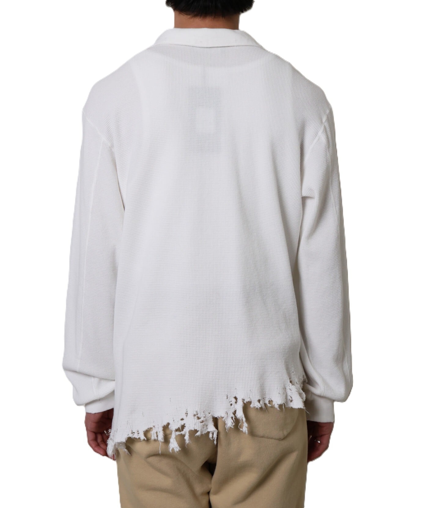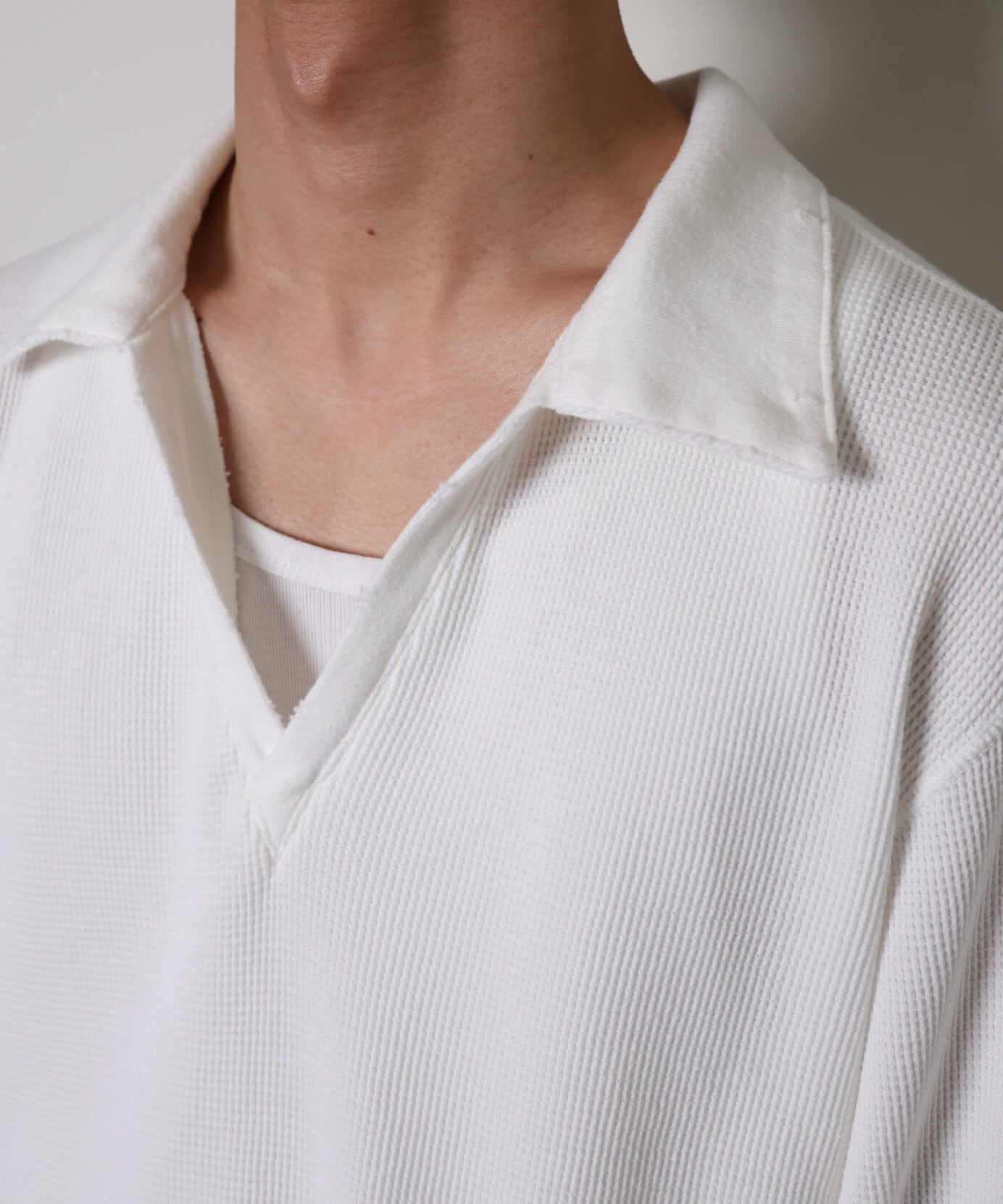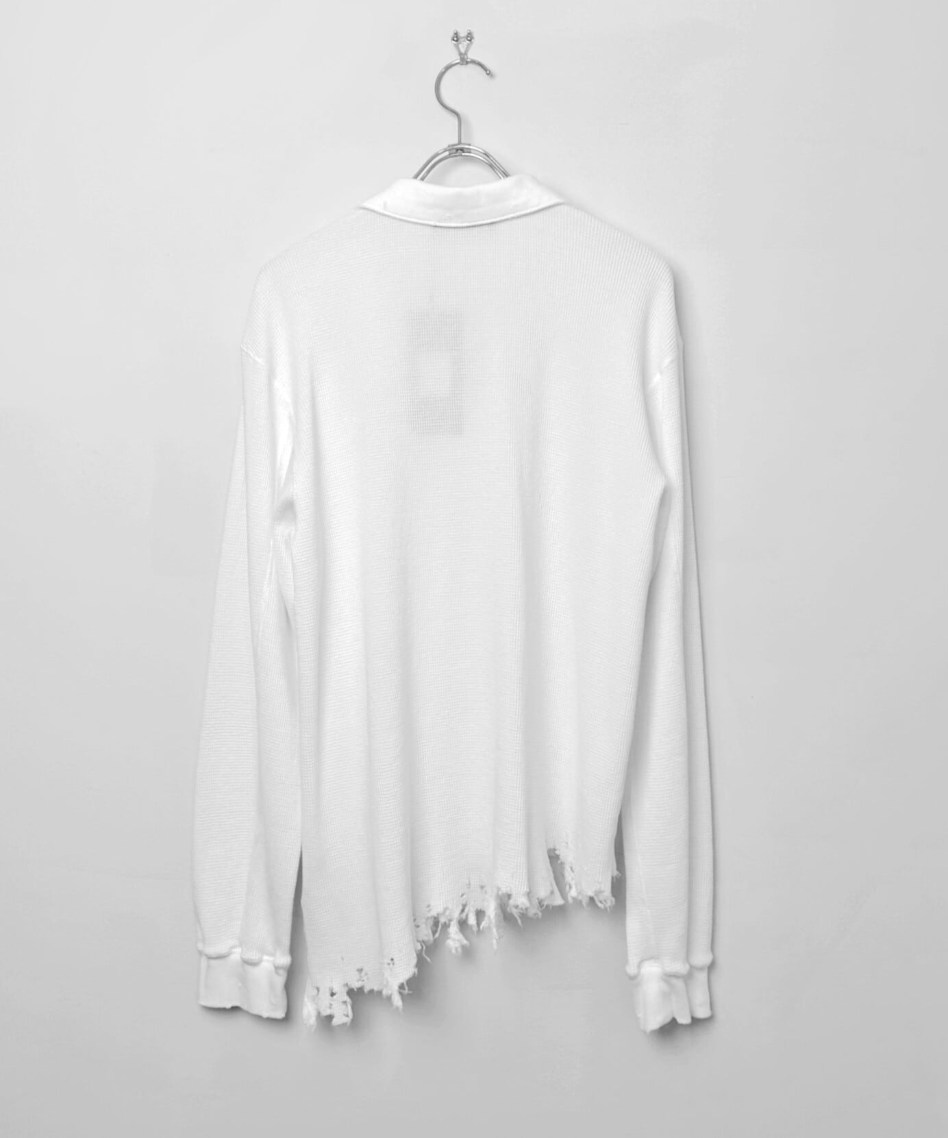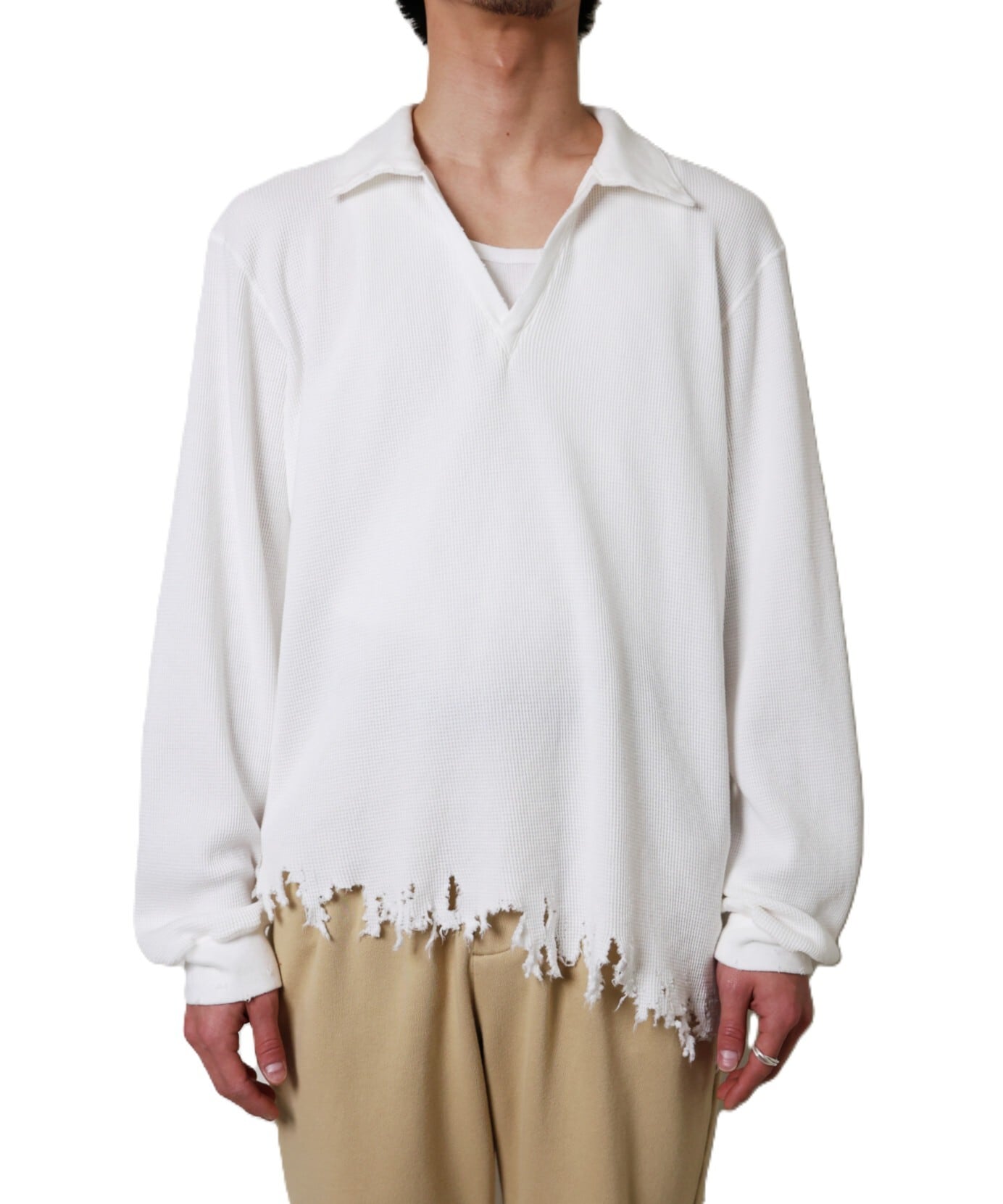 ブランドの定番でもあるサーマルシリーズをアップデートし製作された新型のスキッパーポロシャツです。シグネチャーディテールでもある裾のアシンメトリーカットやグラインダーを用いた手作業のダメージ加工はそのままに、前下がりの衿と立体的な2枚袖、袖リブ仕様など上品な佇まいにまとめたバランス。