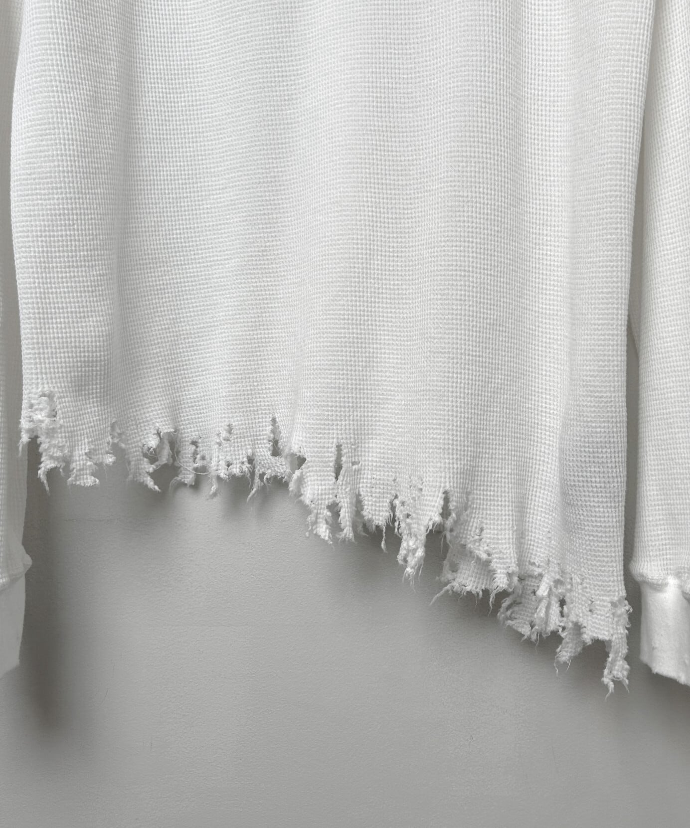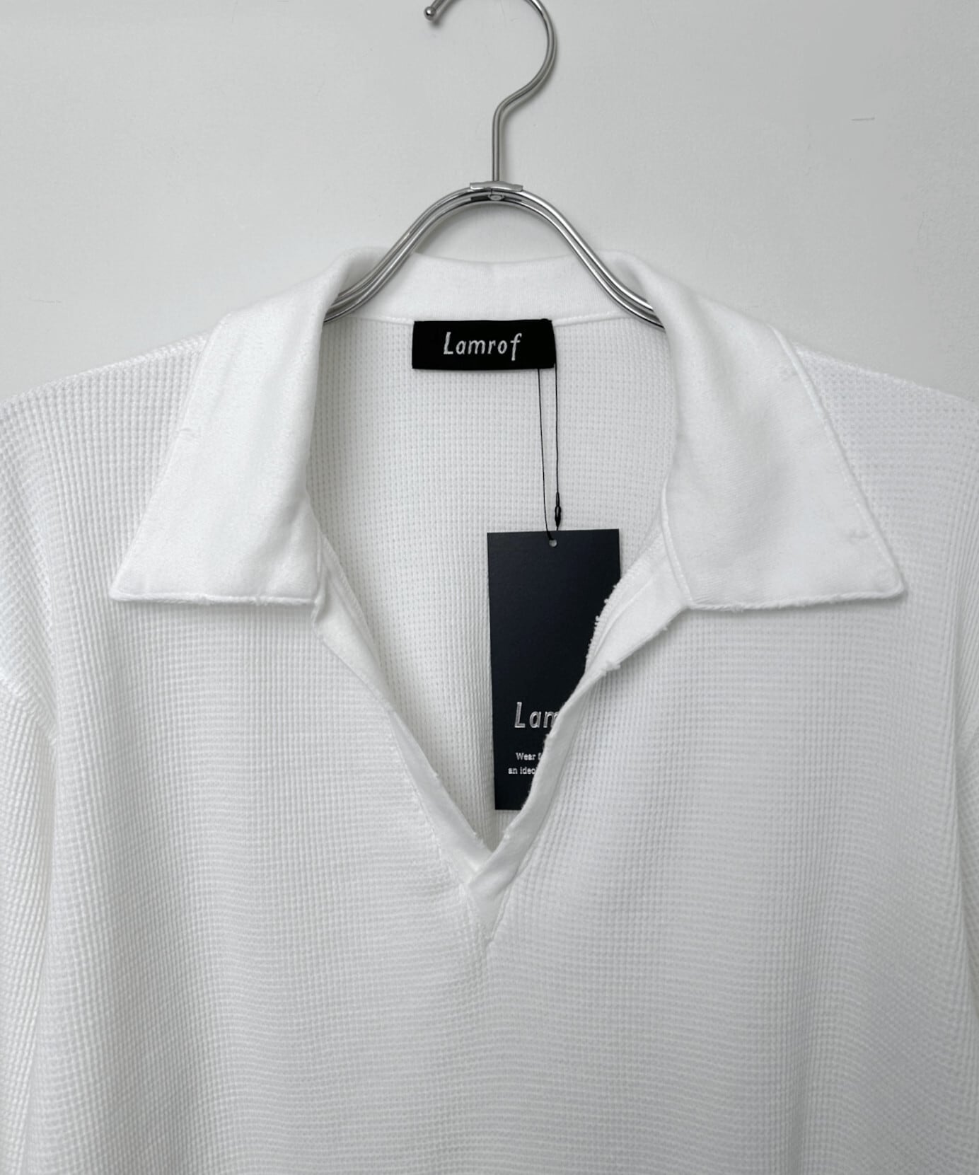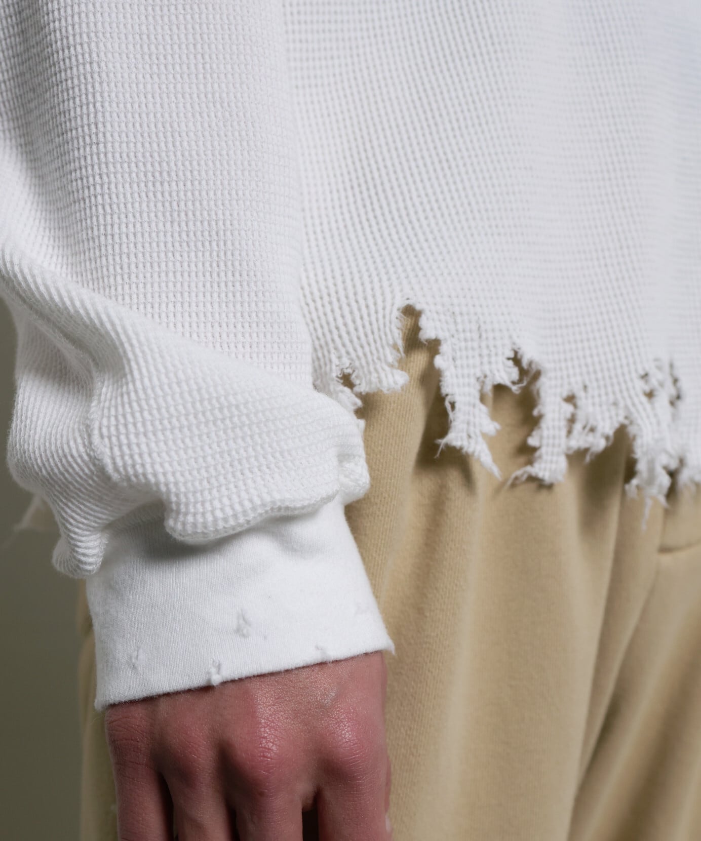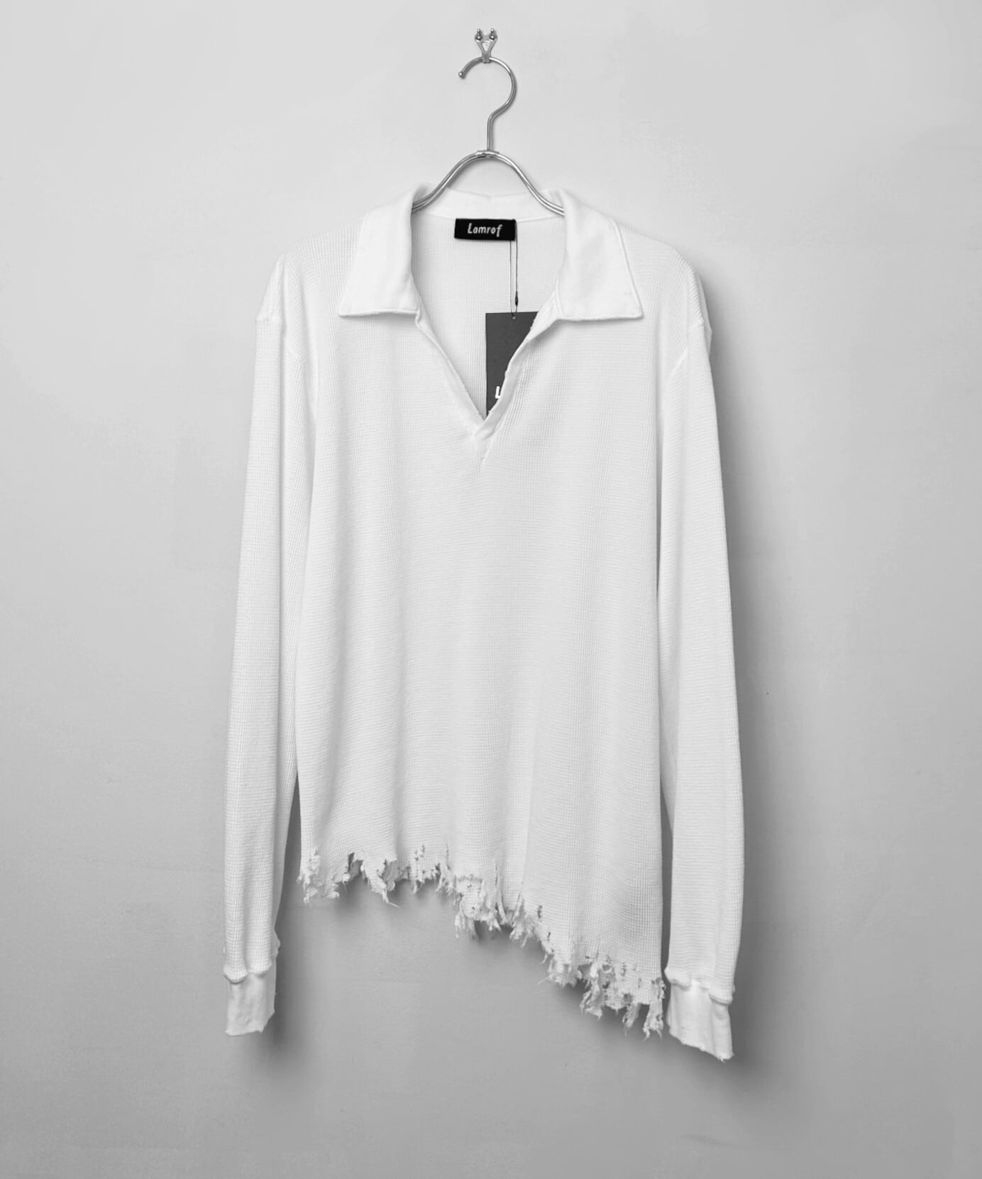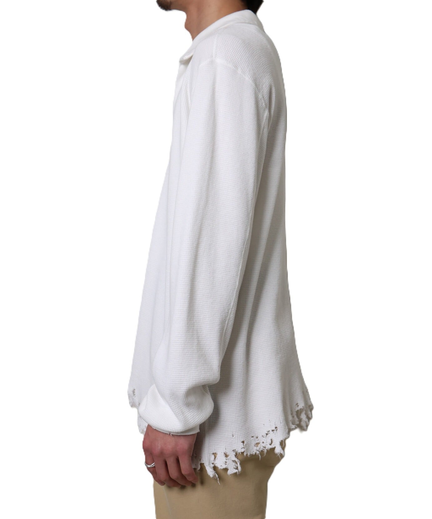 ブランドの定番でもあるサーマルシリーズをアップデートし製作された新型のスキッパーポロシャツです。シグネチャーディテールでもある裾のアシンメトリーカットやグラインダーを用いた手作業のダメージ加工はそのままに、前下がりの衿と立体的な2枚袖、袖リブ仕様など上品な佇まいにまとめたバランス。