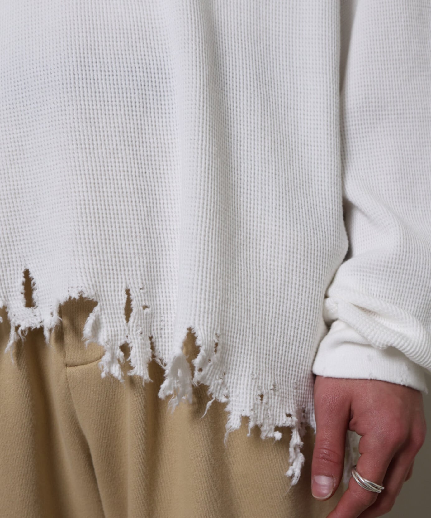 さらに、アシンメトリーな裾やボロ加工の襟・裾がさりげないアクセントに。インナー使いしたときも、レイヤードにしっかり表情を出してくれます。サーマルならではの保温性と肌離れの良さもあり、着心地も良いです。