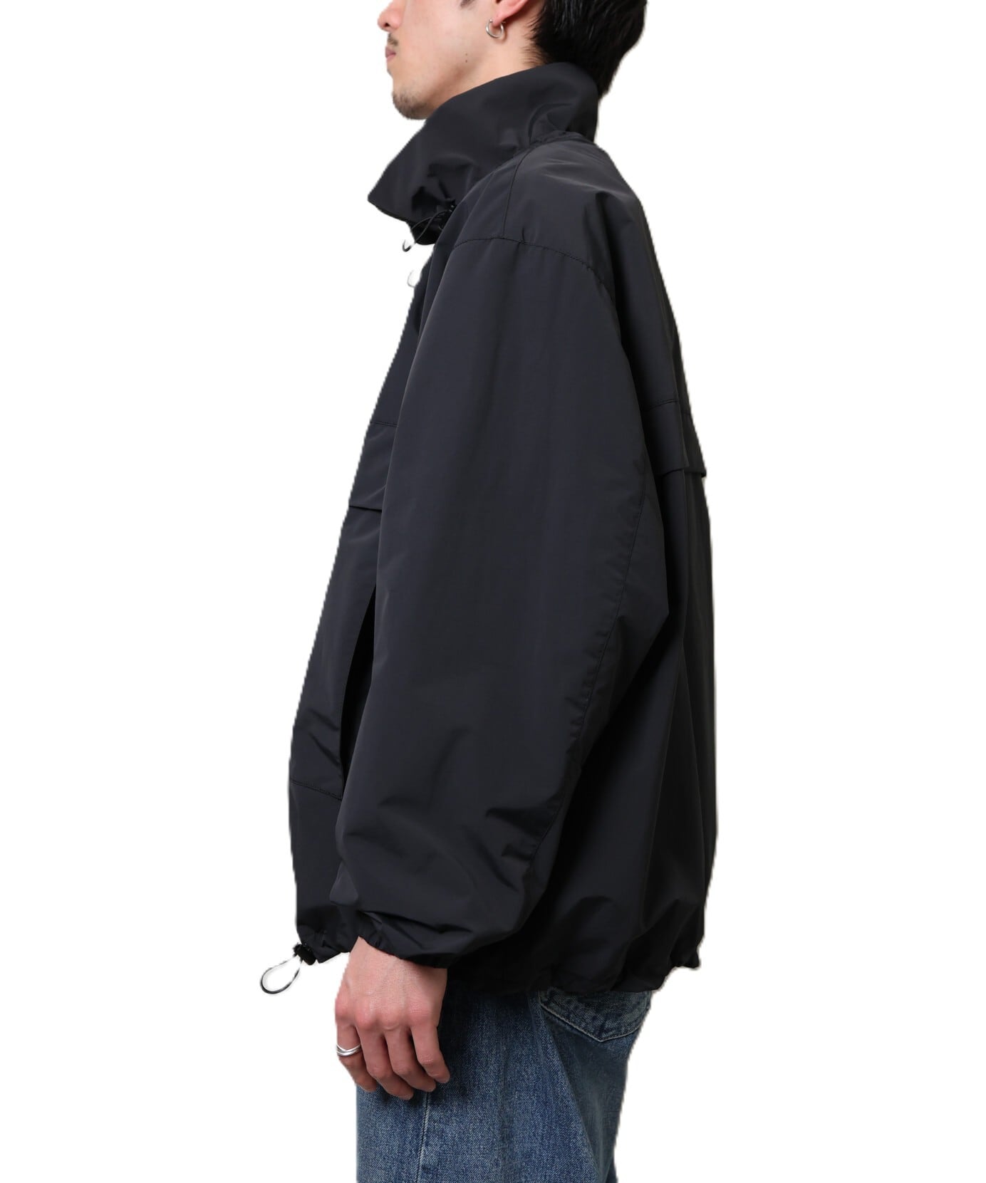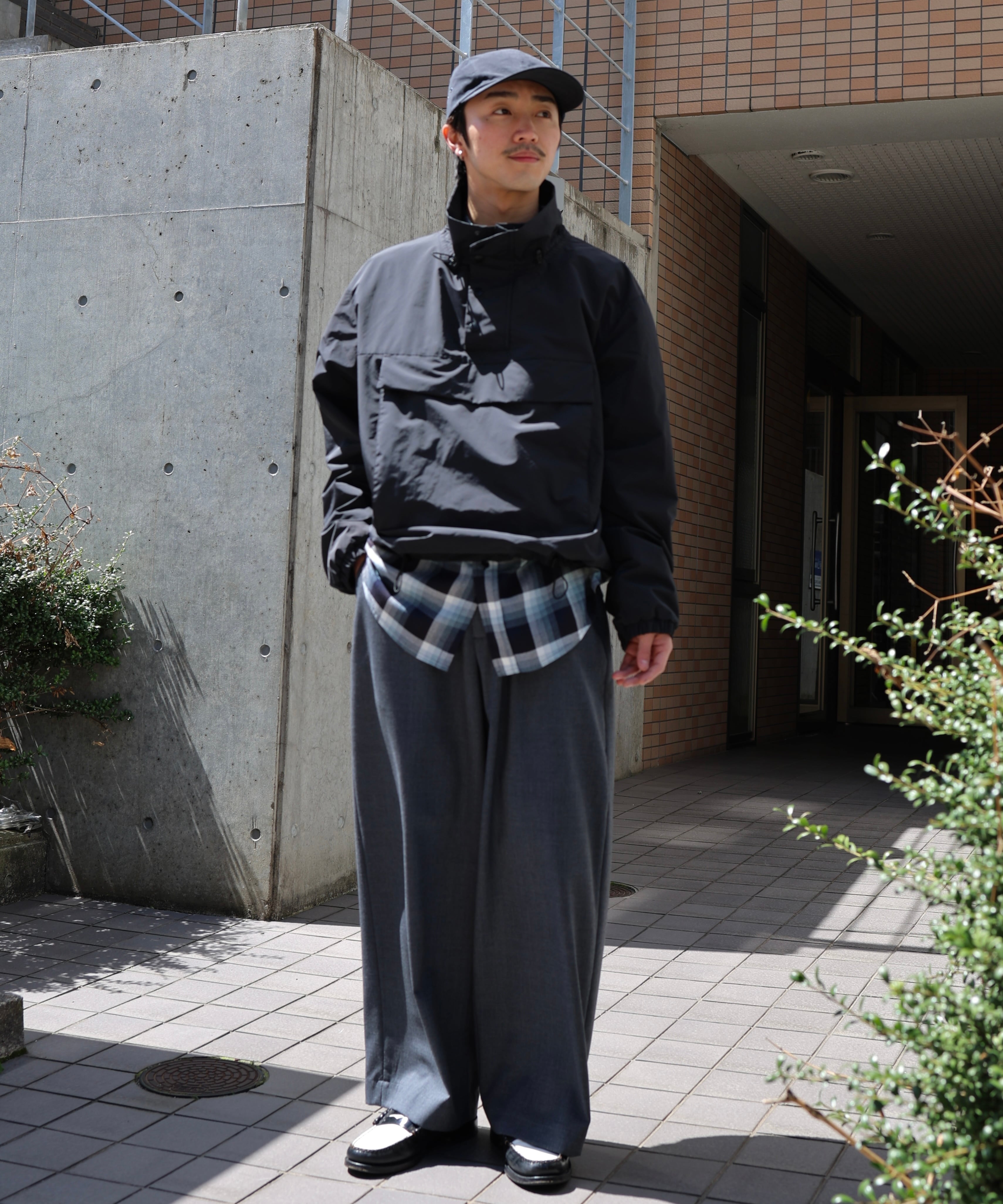 ナイロン素材にジップが付くと機能的な印象が強くなりがちですが、アノラックはそういった要素が抑えられている分、程よくラフな印象になります。