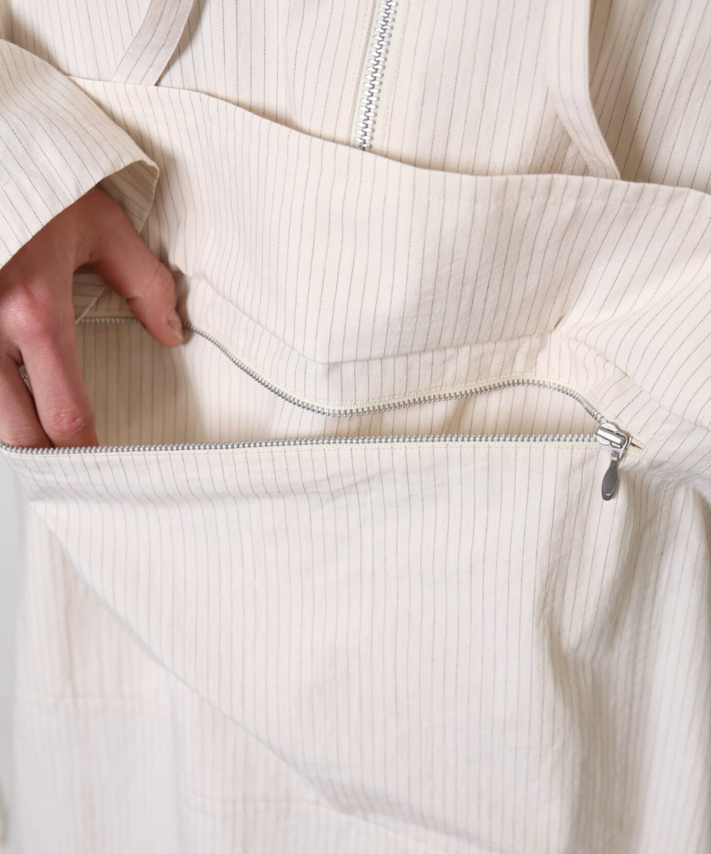 緯糸にボイル糸を使用し、独特のハリと細かな凹凸を持たせたストライププルオーバージャケット。