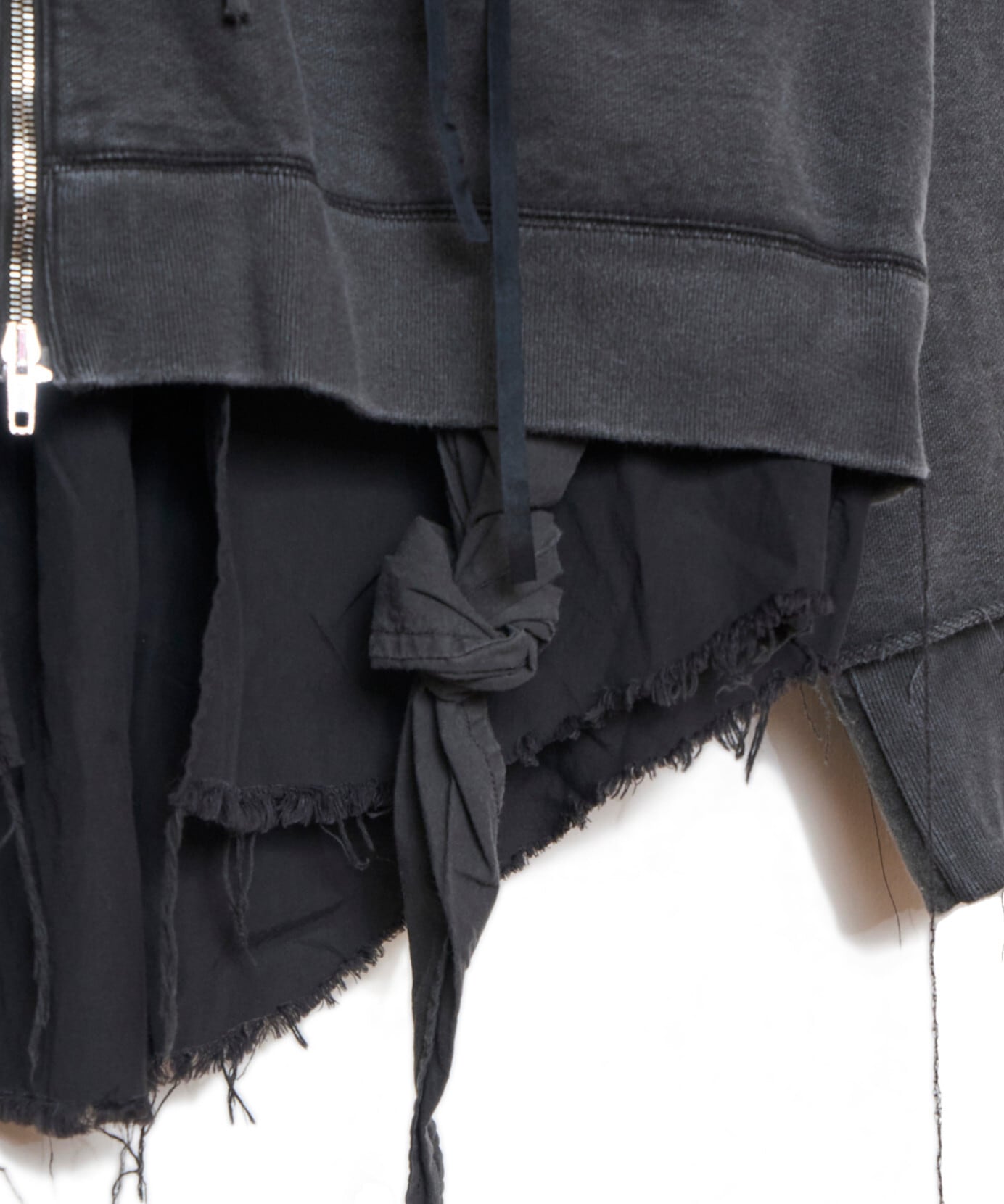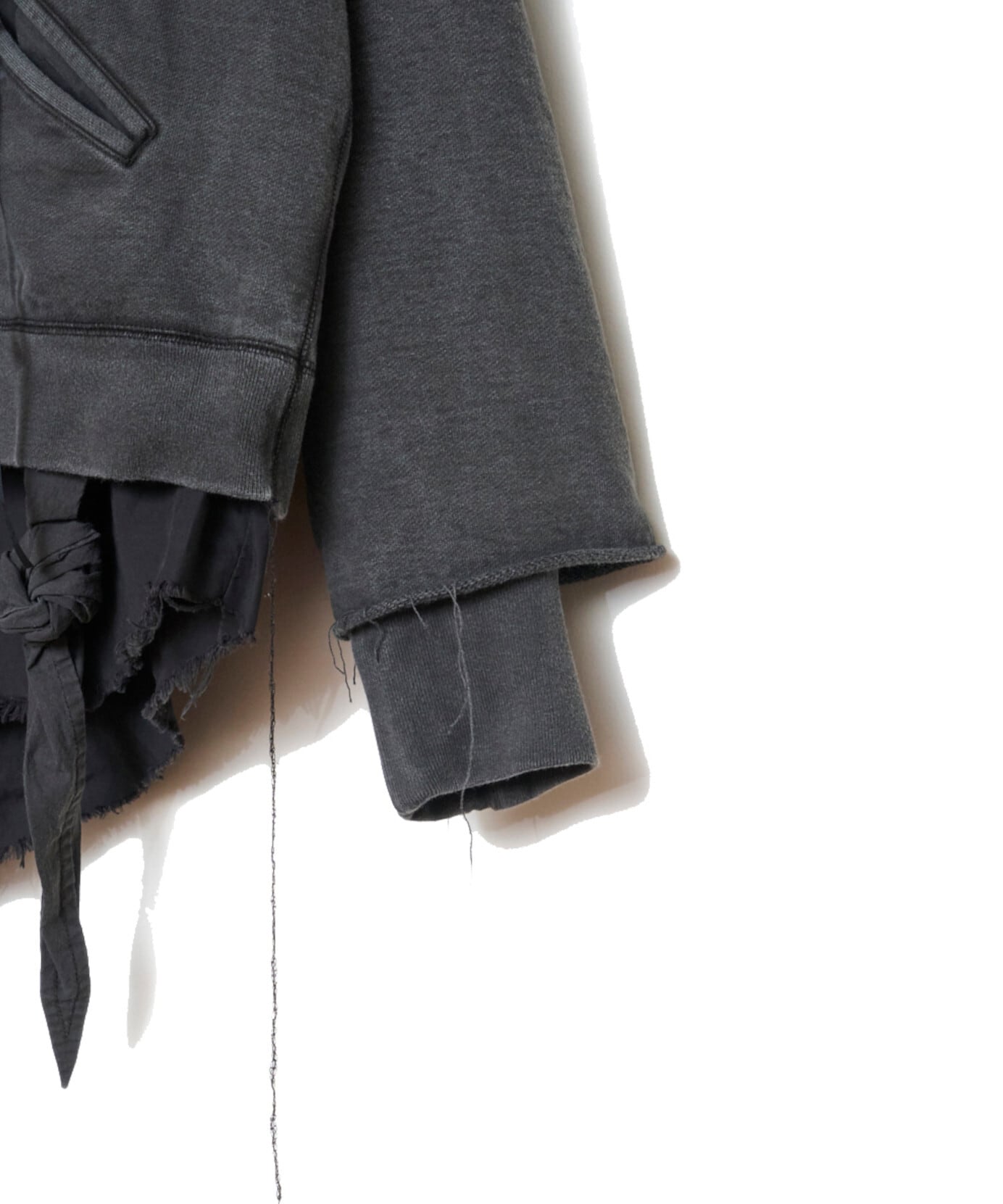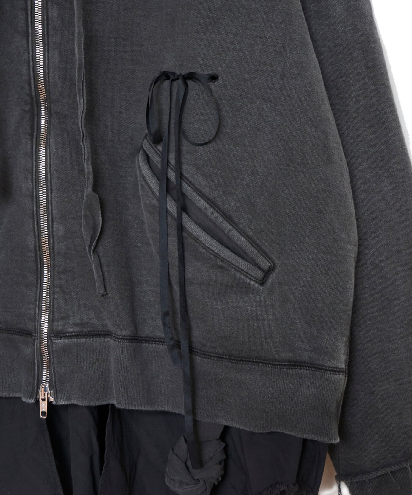 緑川氏のアーティザナルな思考を反映したウェアには、リボンテープや、袖や裾からはみ出る生地といったデコラティブなディテールが施されている。