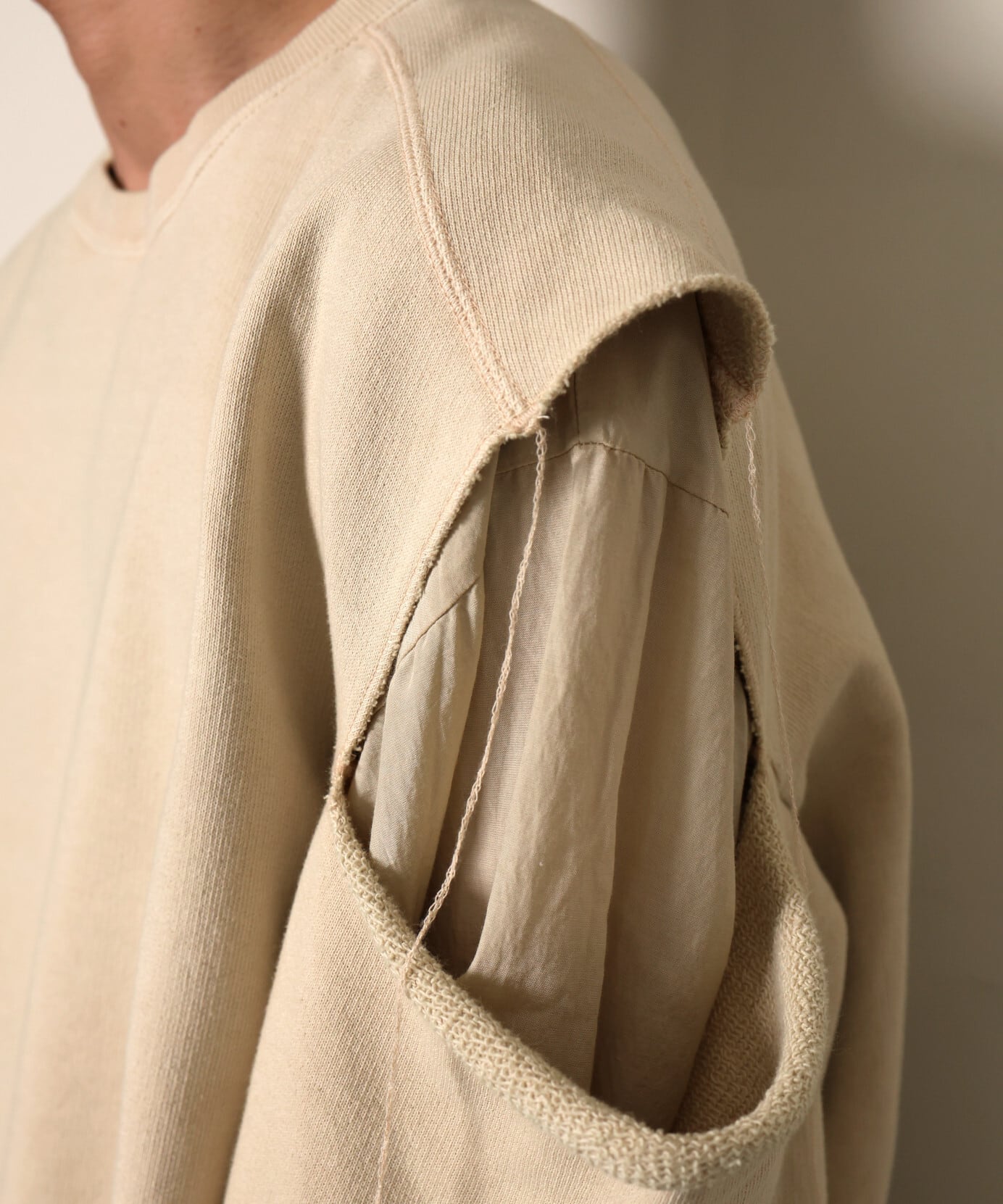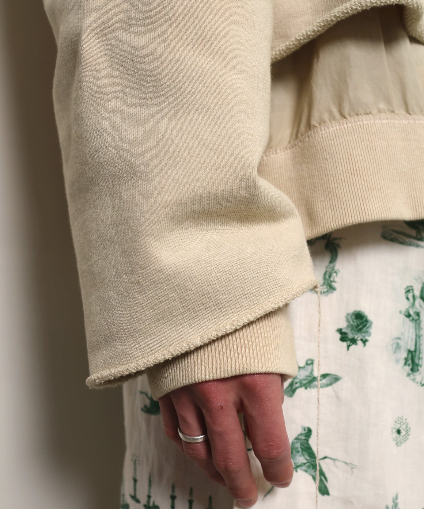 スウェットの厚みとナイロンの軽さのコントラストが絶妙な1着。