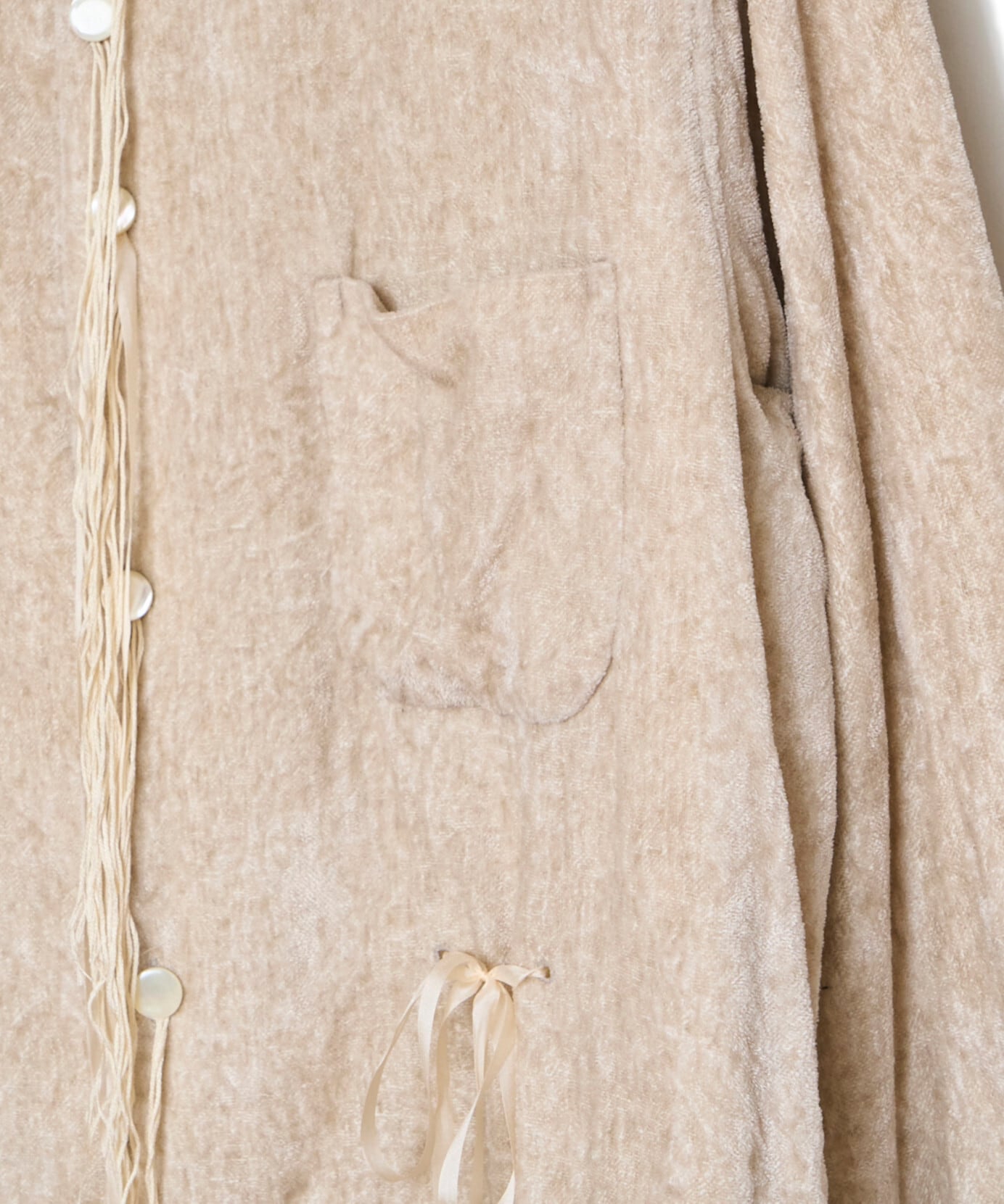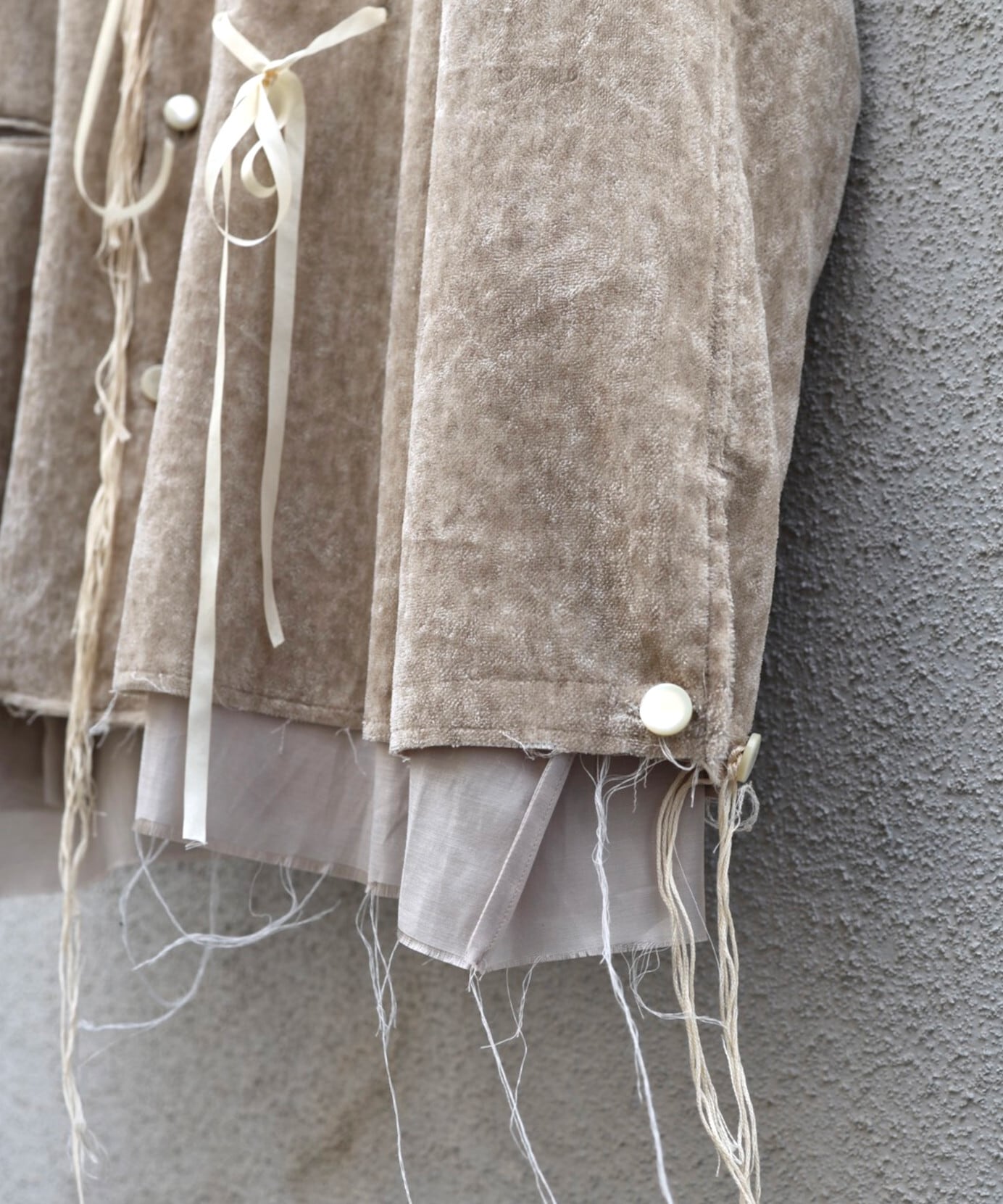 緑川氏のアーティザナルな思考を反映したウェアには、リボンテープや、袖や裾からはみ出る生地といったデコラティブなディテールが施されている。