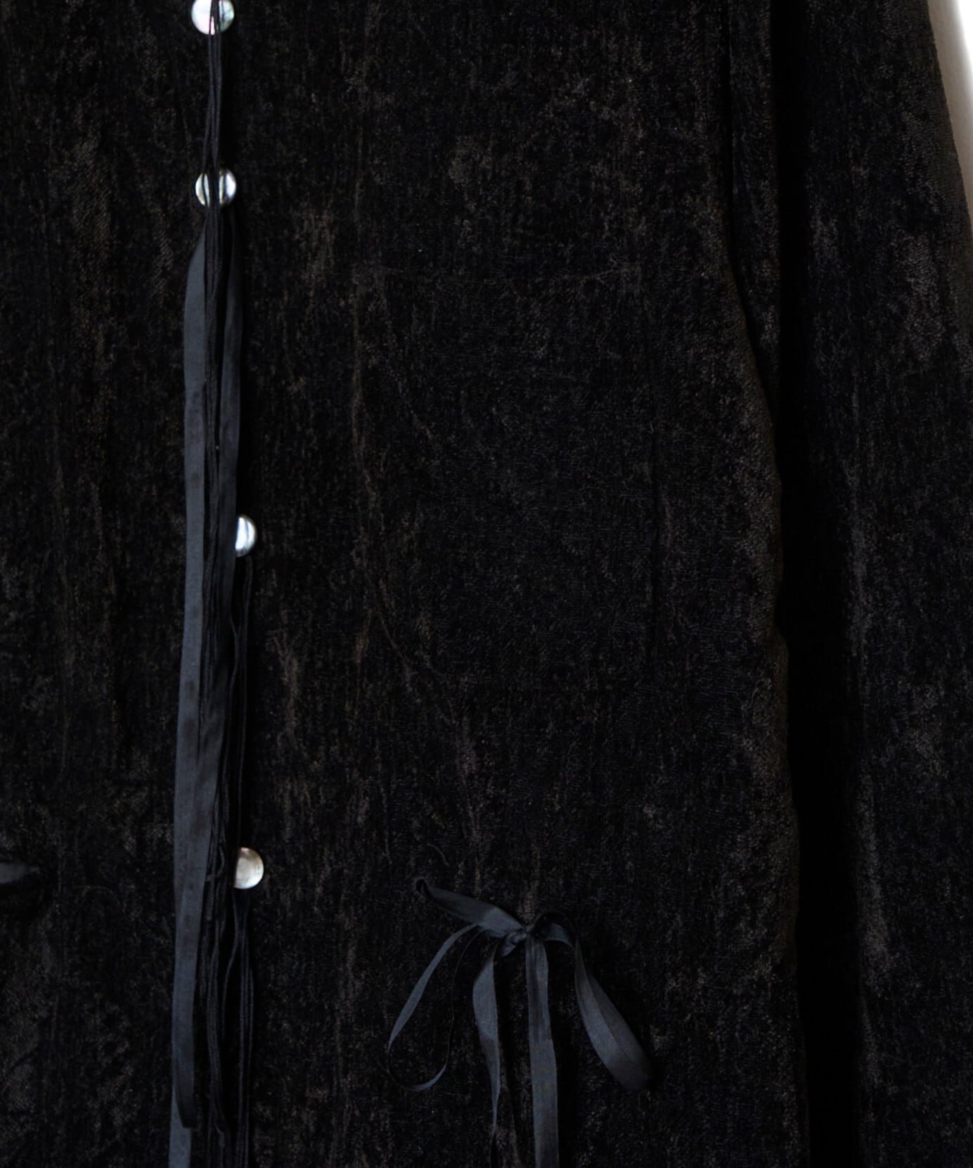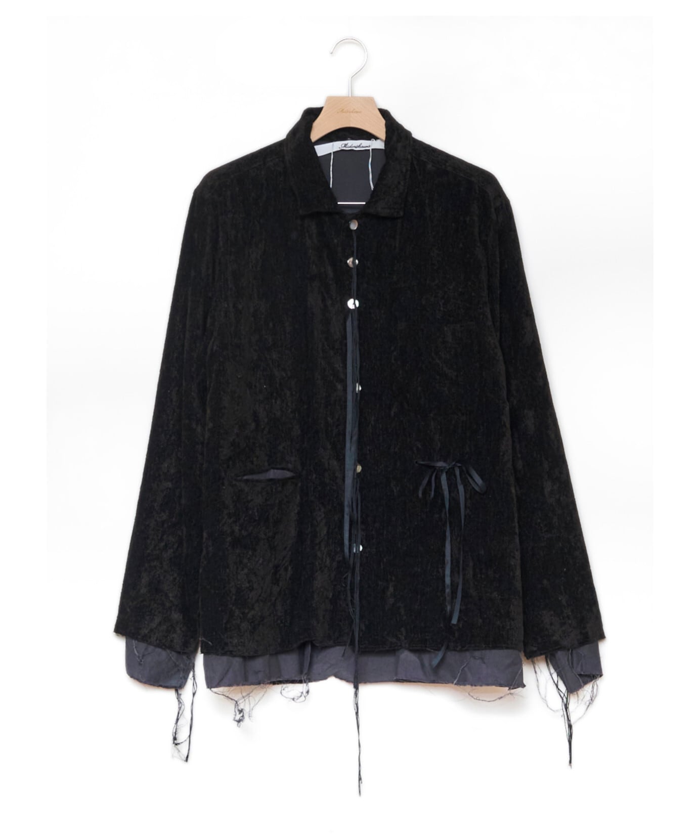 緑川氏のアーティザナルな思考を反映したウェアには、リボンテープや、袖や裾からはみ出る生地といったデコラティブなディテールが施されている。