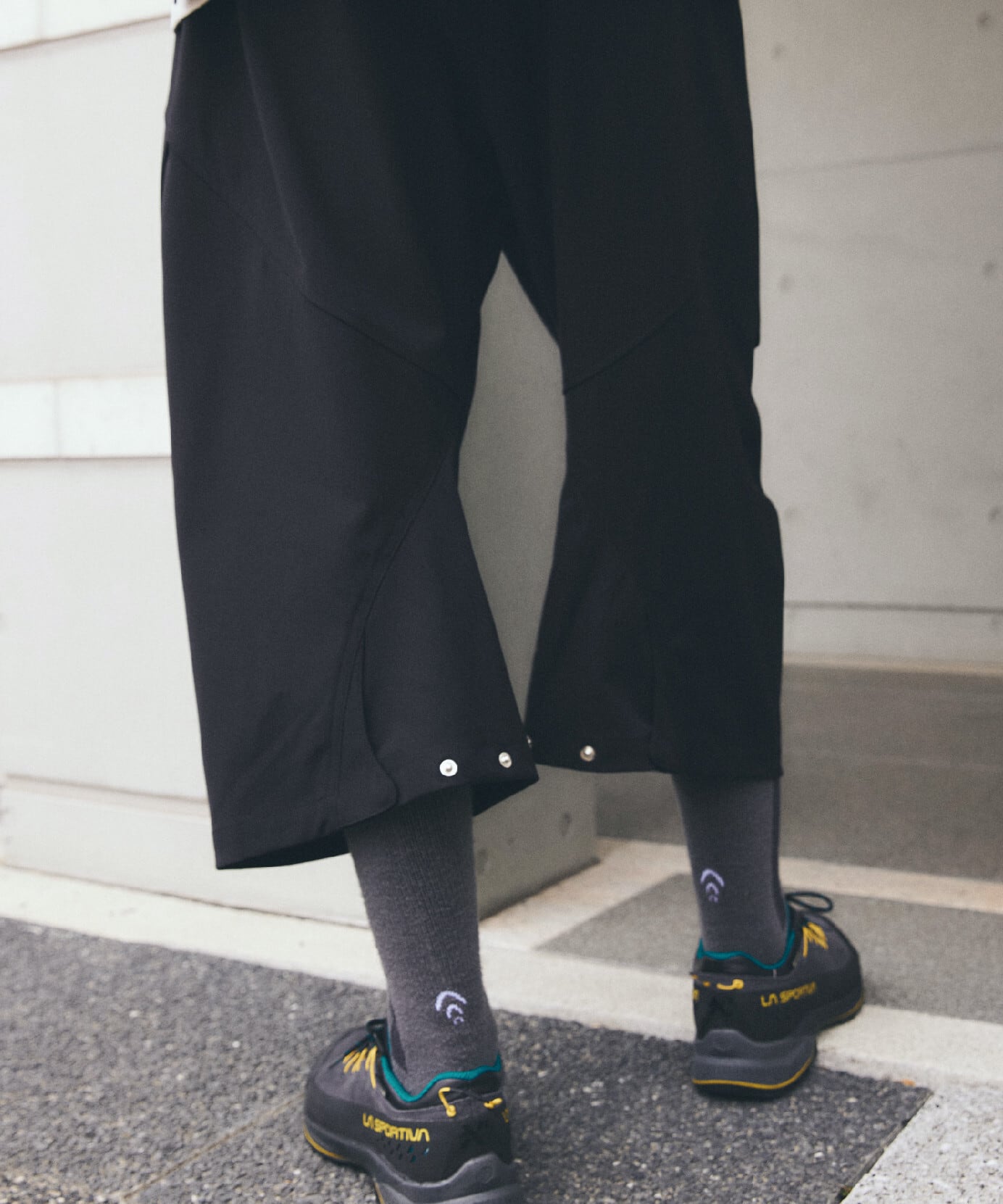 脇のシームにひねりを加え、膝に向かって湾曲した独特のシルエットにより、動きやすさと快適性を追求。