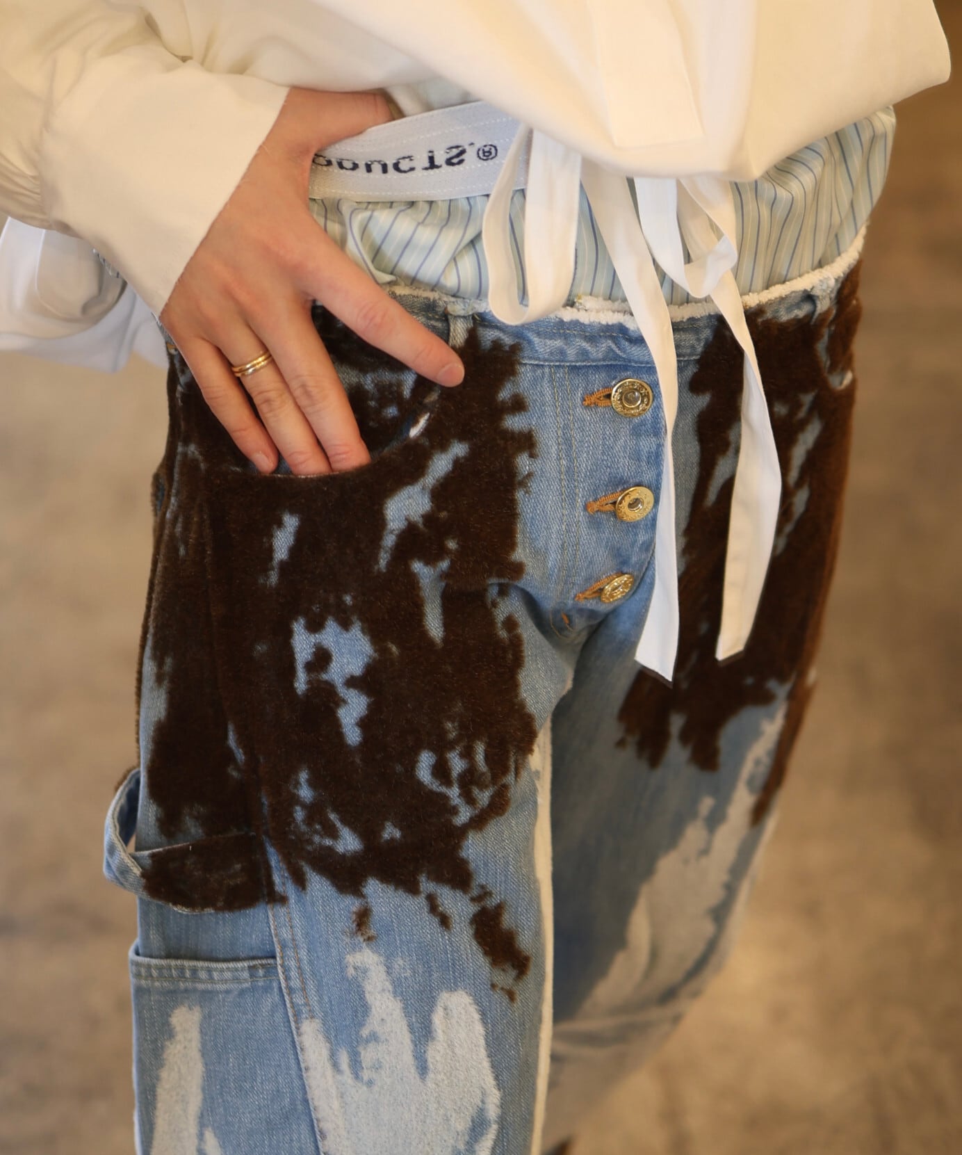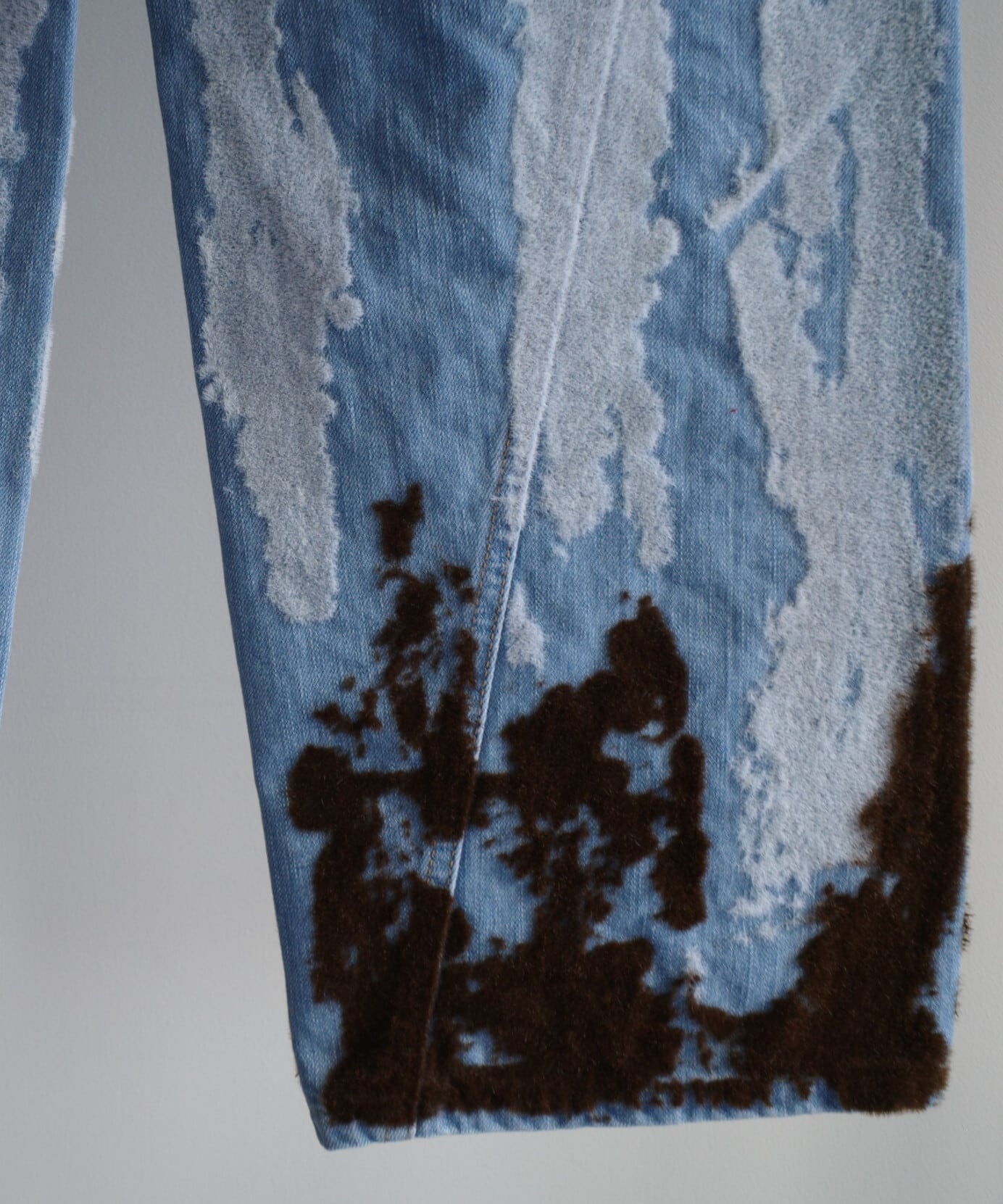 ベースのデニムは、洗い込んで薄くなったライトブルーにブリーチを重ね、