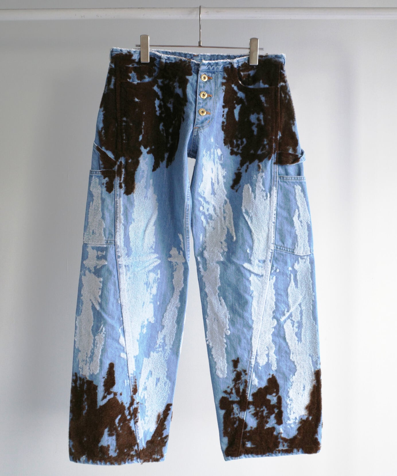 フロッキー加工は、美しく起毛する最大値である3mmで施されており、その贅沢な分量感も魅力。ランダムに見えつつ計算されたバランスで配置されています。さらに、フロントのゴールドボタンやポケットのハート刺繍、星型のリベットなど、無骨なペインターパンツに程よい遊び心と品の良さをプラスしています。