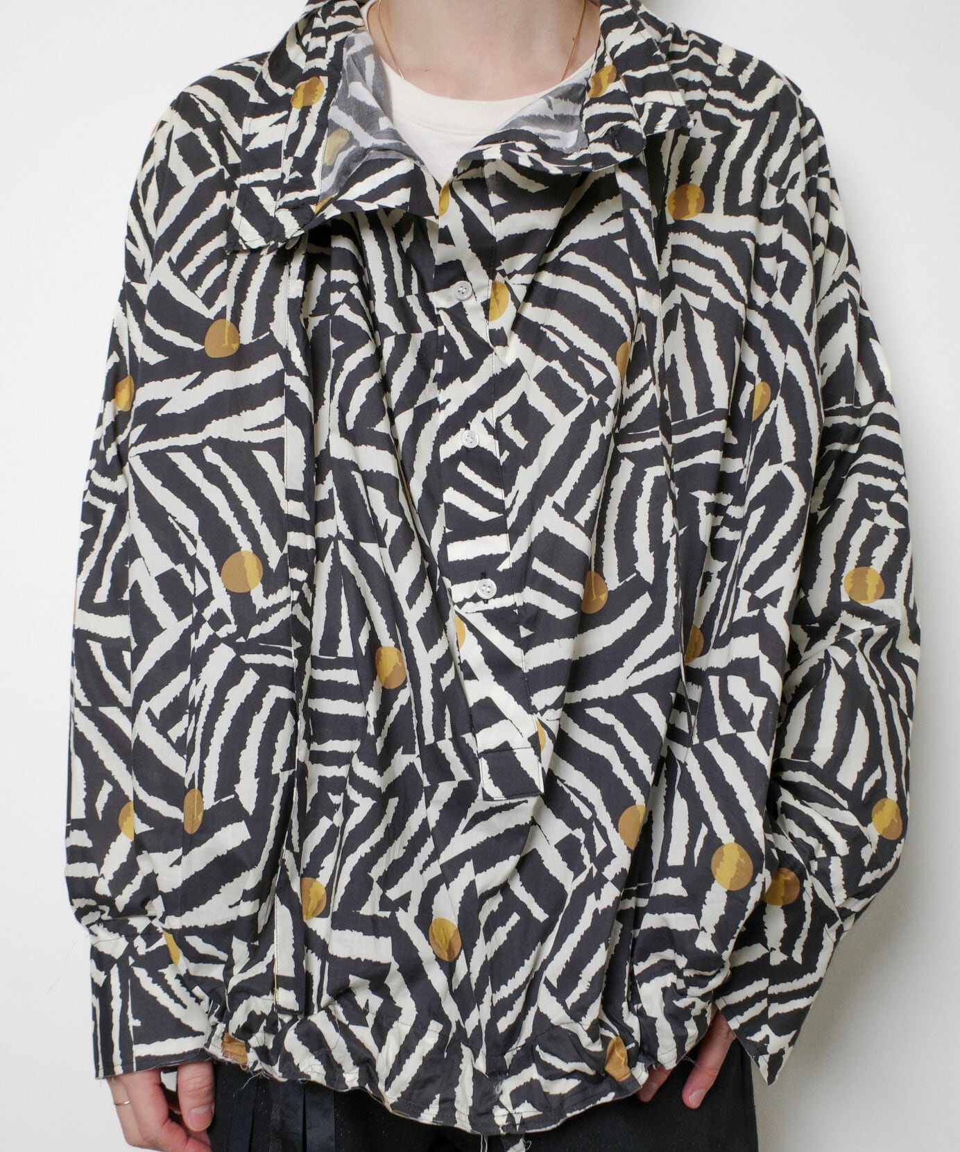 すべてボタンを留めて首元の紐を絞れば、ぐっとエレガントな印象に。首元の収まりも良くなるため、上からジャケットを羽織るスタイルにも相性抜群です。裾を絞ればライトアウターのようなカジュアルな見え方に、絞らなければアンティークシャツらしい上品さが際立ちます。