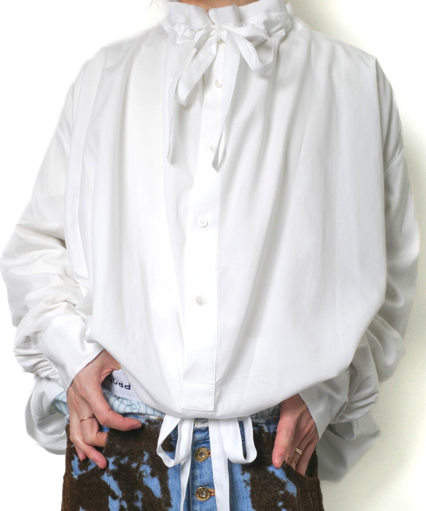 すべてボタンを留めて首元の紐を絞れば、ぐっとエレガントな印象に。首元の収まりも良くなるため、上からジャケットを羽織るスタイルにも相性抜群です。裾を絞ればライトアウターのようなカジュアルな見え方に、絞らなければアンティークシャツらしい上品さが際立ちます。