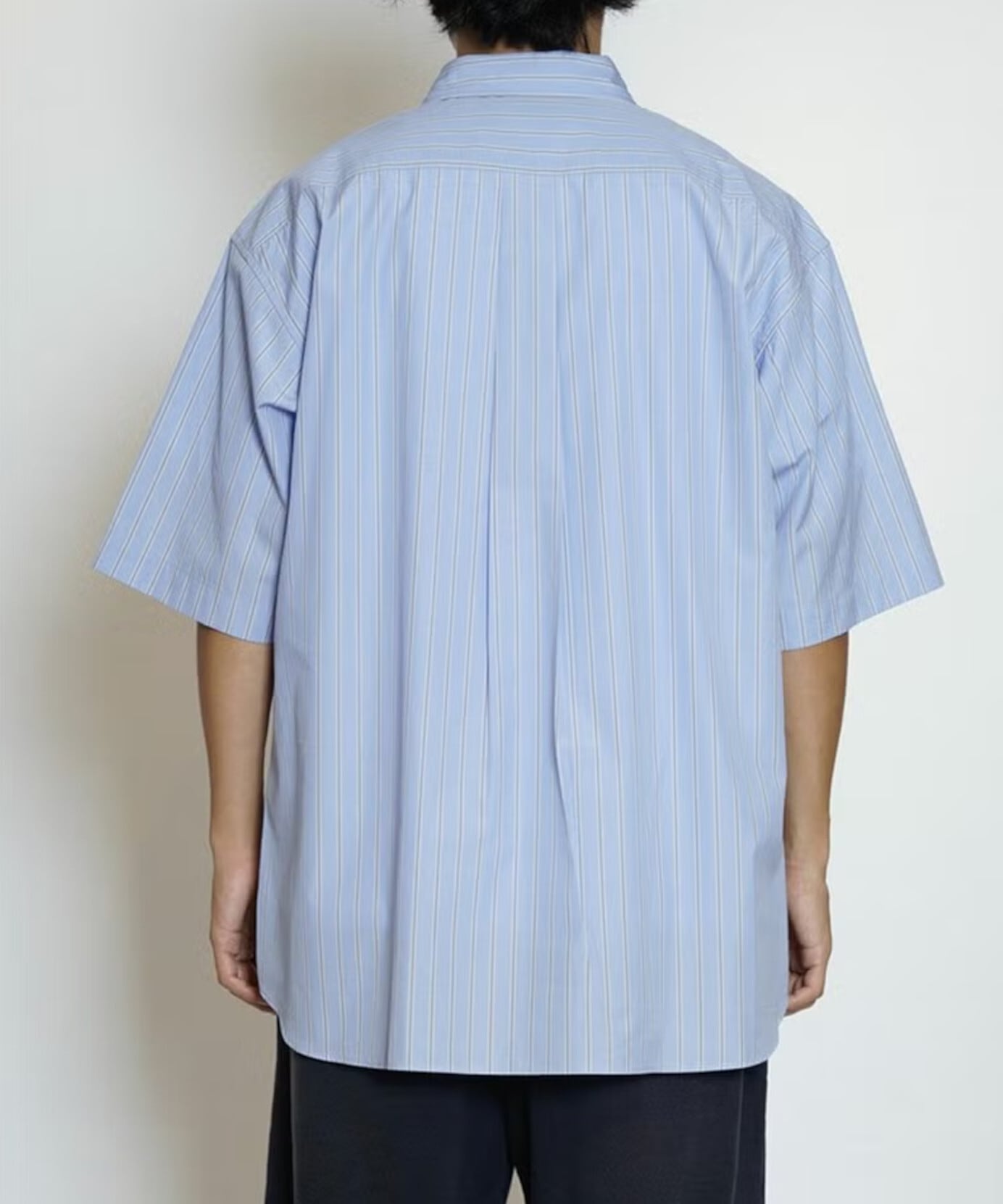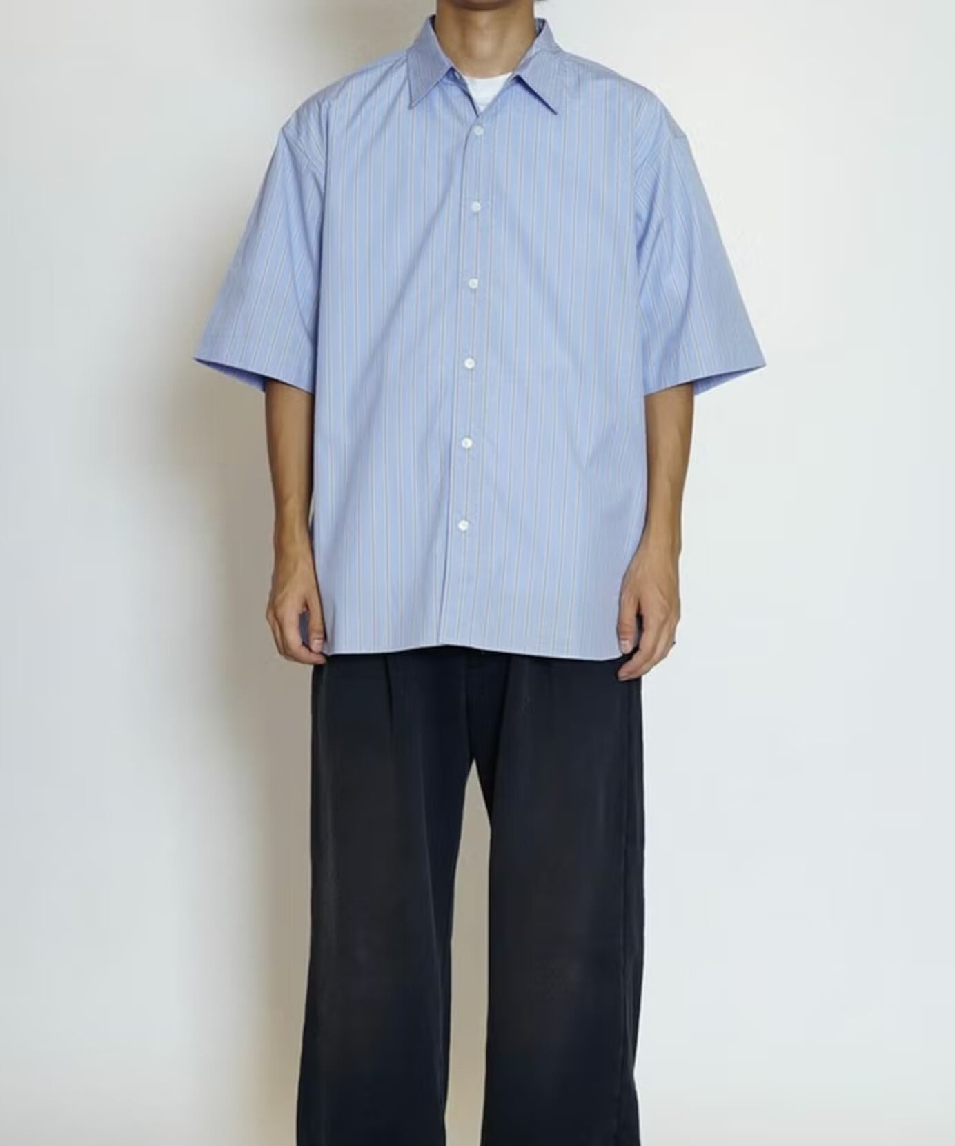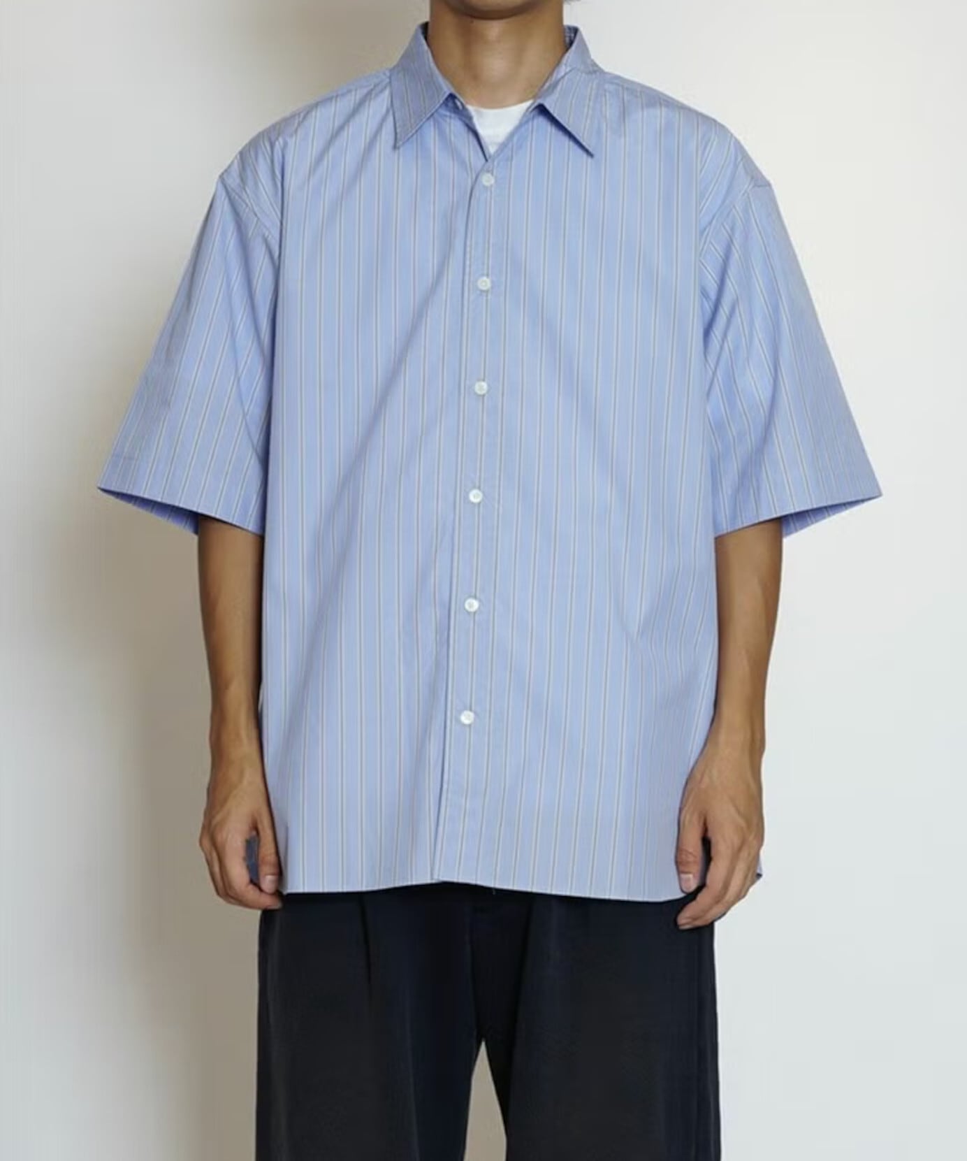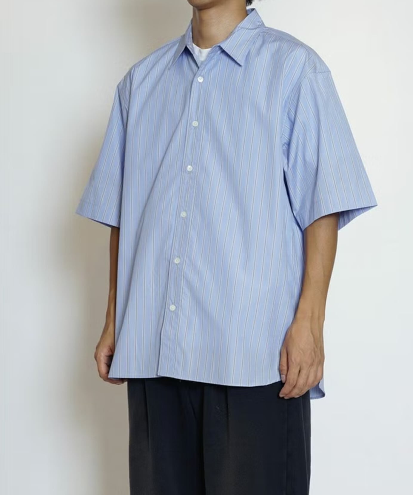 スーピマ原料を使用した100/2の清涼感あるカラーのストライプを使用したレギュラー半袖シャツ。