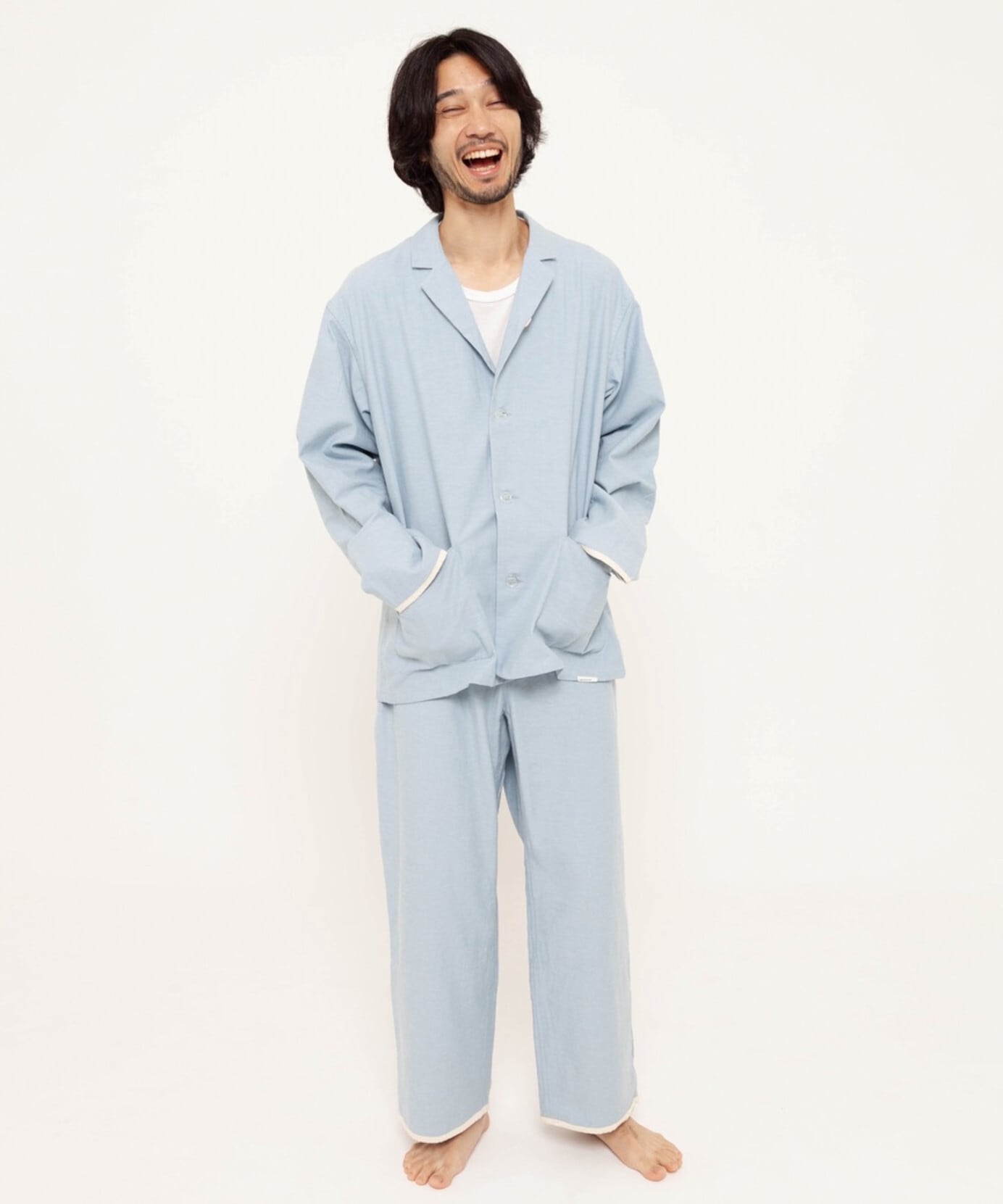 「襟の形がジャケット襟(ノッチドラペル)なのがパジャマ姿のままでもだらしなく見えないポイントです。」