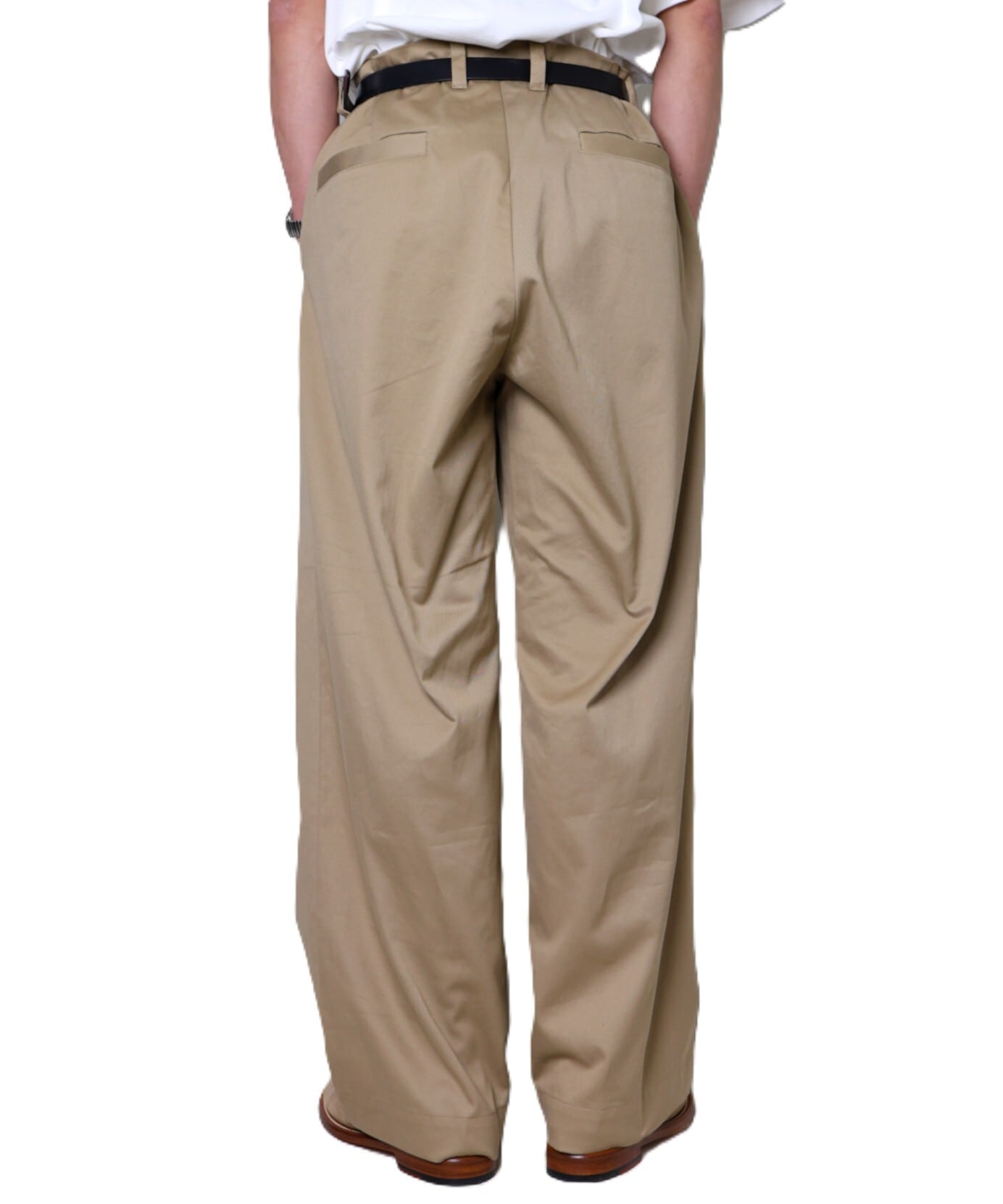 コールドマーセ加工で上品な光沢を引き出した〈NO TUCK WIDE CHINO TROUSERS〉が登場。