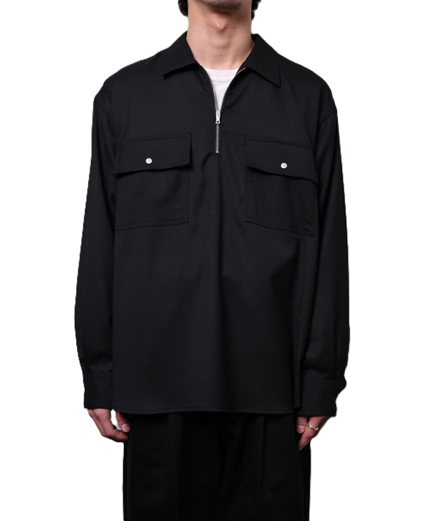 ウールのしなやかさとレーヨンの落ち感を掛け合わせた生地を使用した、ハーフZIP仕様のプルオーバーシャツ。