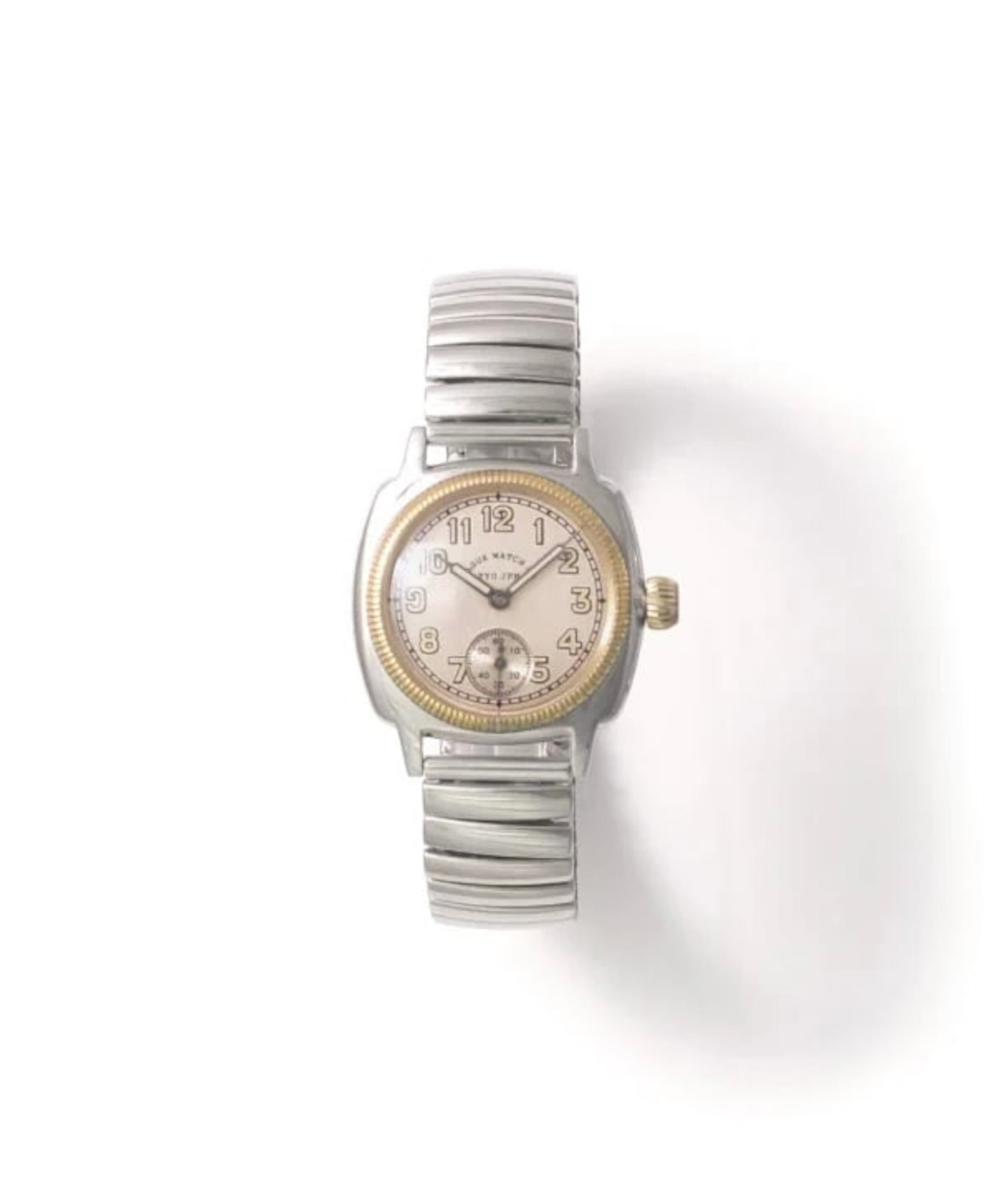 採用したエクステンションベルトは1950年代のミッドセンチュリー期にアメリカンウォッチなどで多く見られたコマの繋ぎ目がバネ式になっているベルトで工具を使わずにご自身でベルトの調整が出来る構造となっております。
